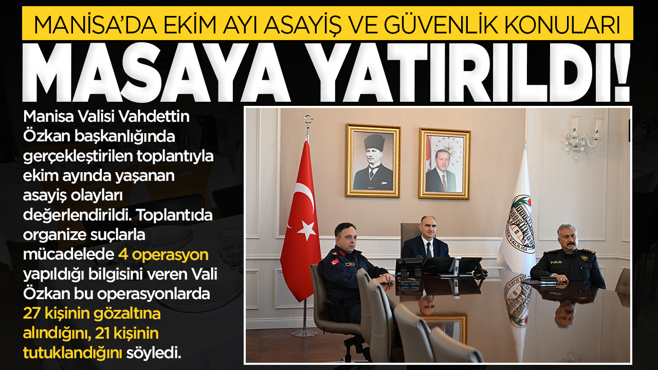 Manisa Valisi Vahdettin Özkan başkanlığında gerçekleştirilen toplantıyla ekim ayında yaşanan asayiş olayları değerlendirildi. Toplantıda organize suçlarla mücadelede 4 operasyon yapıldığı bilgisini veren Vali Özkan bu operasyonlarda 27 kişinin gözaltına alındığını, 21 kişinin tutuklandığını söyledi.