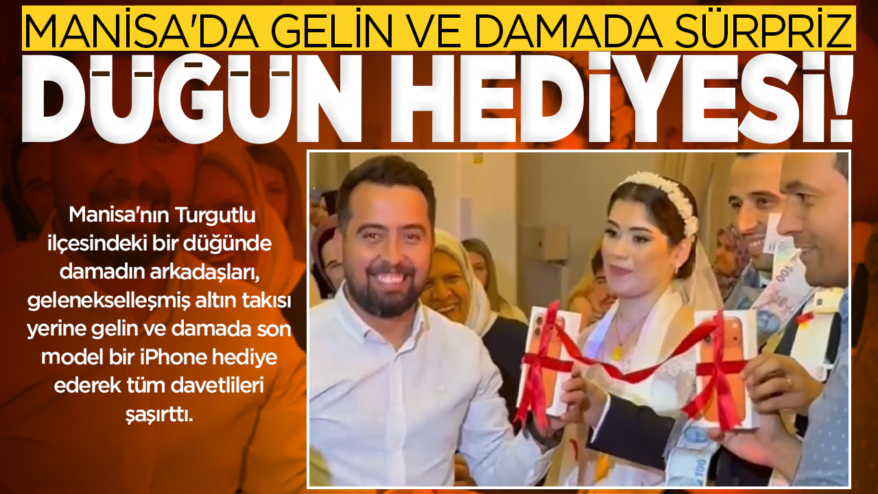 Turgutlu'nun tanınmış esnaflarından Uğur Aktaş ile Gülben Aktaş, düzenlenen görkemli bir törenle hayatlarını birleştirdi. Düğünün en çok konuşulan anı ise takı merasimi oldu. Damadın arkadaşları, sıraya girip tebriklerini ilettikten sonra, yanlarında getirdikleri kutuyu açarak bir iPhone 17 Pro Max cep telefonunu gelin ve damadın üzerine taktı.