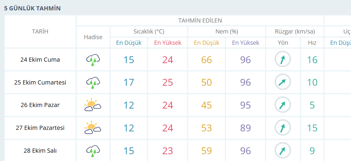 24 Ekim Cuma: Hava yağmurlu (yer yer sağanak) geçecek. En düşük sıcaklık 15∘C, en yüksek sıcaklık ise 24∘C olarak bekleniyor. Nem oranı %66 ile %96 arasında olacak. Rüzgar güney yönlerden 16 km/sa hızla esecek.