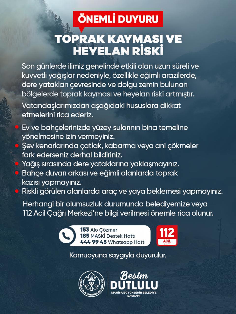 Son günlerde etkili olan uzun süreli ve kuvvetli yağışlar nedeniyle; özellikle eğimli arazilerde, dere yatakları çevresinde ve dolgu zemin bulunan bölgelerde toprak kayması ile heyelan riskinin arttığı açıklandı. Manisa Büyükşehir Belediyesi, vatandaşların şu hususlara dikkat etmesini rica etti: