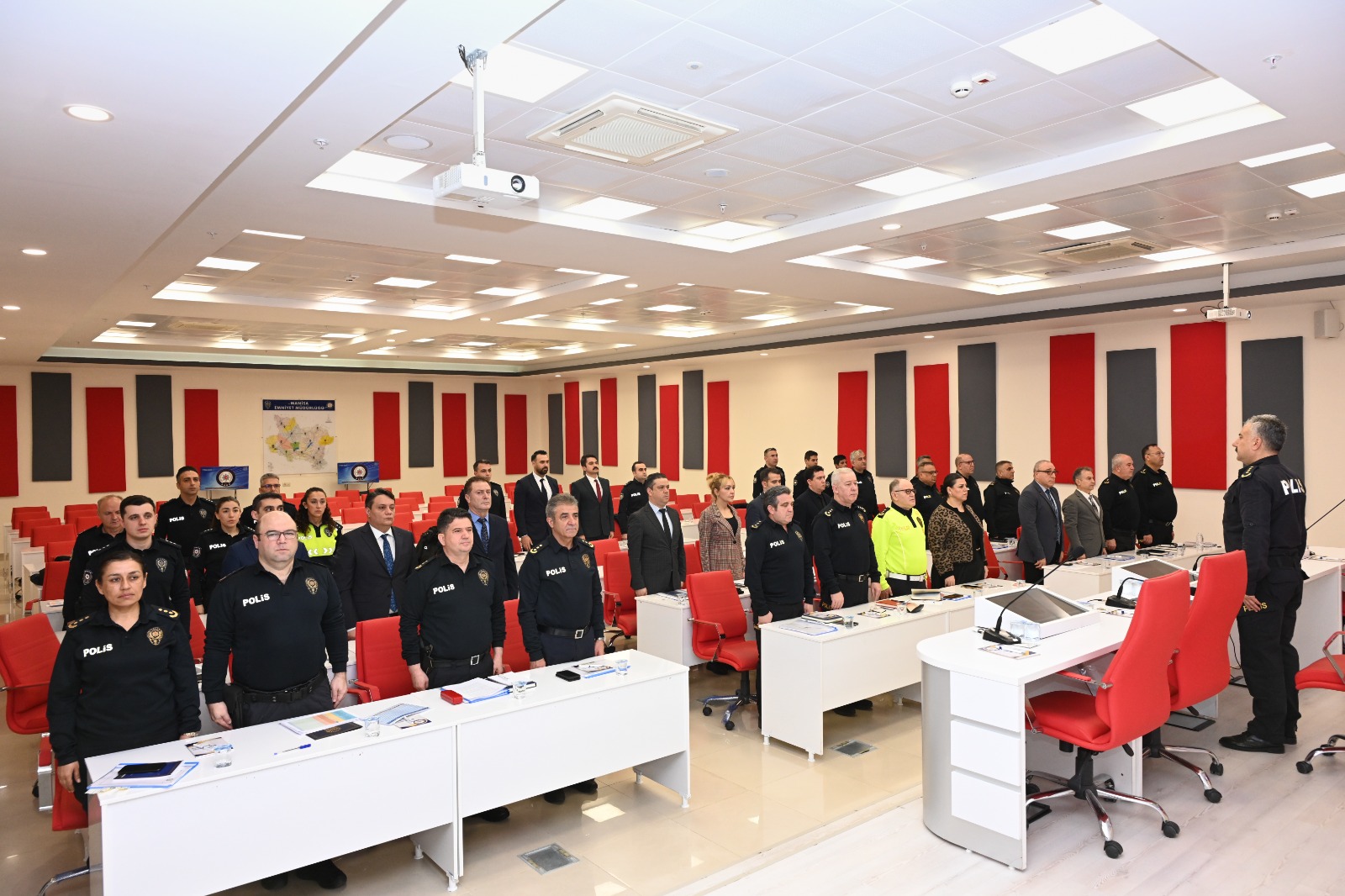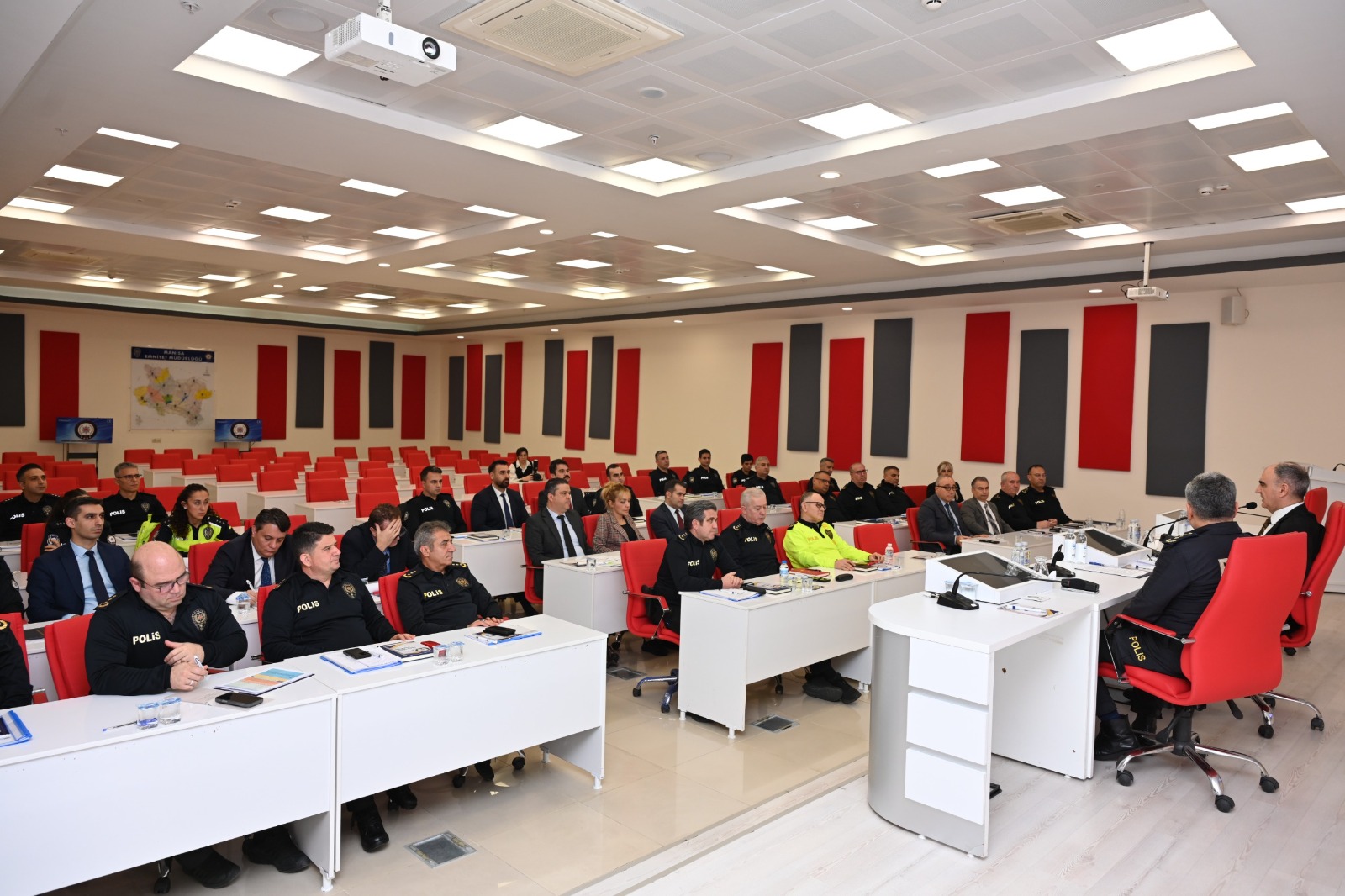 Manisa Valisi Vahdettin Özkan’ın teşrifleriyle Kanuni Sultan Süleyman Toplantı Salonu’nda gerçekleştirilen toplantıya, İl Emniyet Müdürü Fahri Aktaş, İl Emniyet Müdür Yardımcıları, ilçe emniyet müdürleri ve amirleri ile şube müdürleri katıldı.
