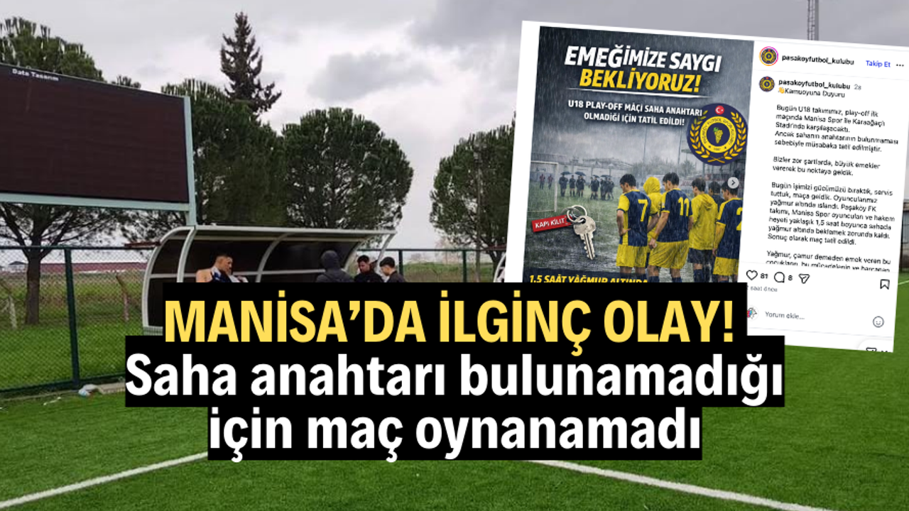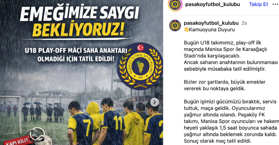 "Bugün U18 takımımız, play-off ilk maçında Manisa Spor ile Karağaçlı Stadı’nda karşılaşacaktı. Ancak sahanın anahtarının bulunmaması sebebiyle müsabaka tatil edilmiştir.