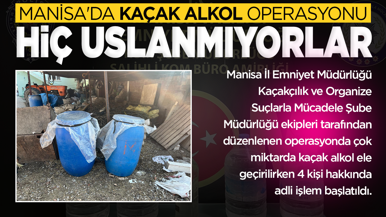 Manisa İl Emniyet Müdürlüğü Kaçakçılık ve Organize Suçlarla Mücadele Şube Müdürlüğü ekipleri tarafından düzenlenen operasyonda çok miktarda kaçak alkol ele geçirilirken 4 kişi hakkında adli işlem başlatıldı.