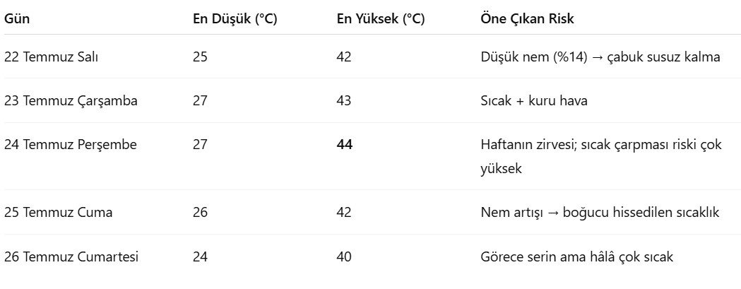 Manisa yeni haftaya çöl sıcaklarını aratmayan bir havayla giriyor. Meteoroloji verilerine göre Salı (22 Temmuz) günü 42 °C ile başlayacak sıcaklıklar, Perşembe günü 44 °C’ye kadar yükselerek yılın en sıcak günlerinden birini yaşatacak. Ardından Cuma 42 °C, Cumartesi ise 40 °C seviyelerine gerilemesi bekleniyor.