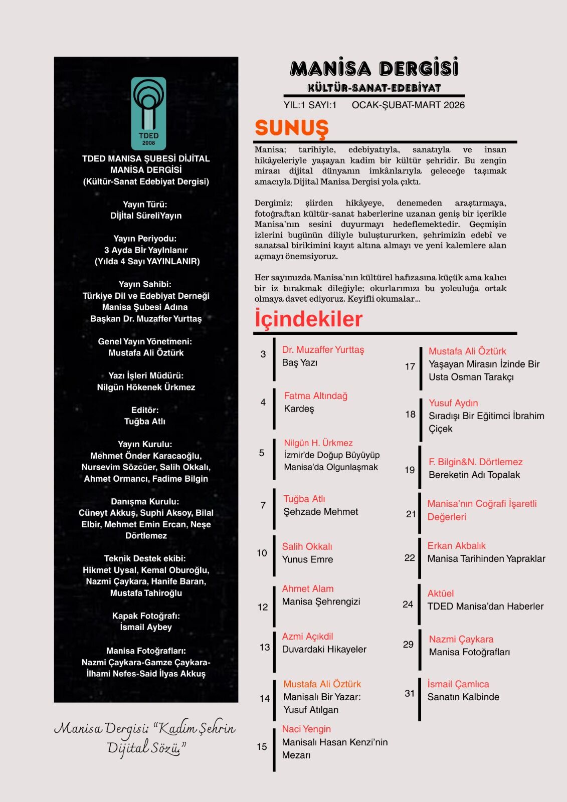 TDED Manisa Şubesi Başkanı Dr. Muzaffer Yurttaş öncülüğünde hazırlanan dergi, Manisa’nın zengin tarihini, kültürünü ve edebî birikimini dijital ortamda daha geniş kitlelere ulaştırmayı hedefliyor. Dergi, şiirden hikâyeye, denemeden araştırmaya, fotoğraftan kültür-sanat haberlerine kadar geniş bir içerik yelpazesi sunarak şehrin kültürel hafızasına katkı sağlamayı amaçlıyor. Derginin kapak fotoğrafı ise Manisalı Fotoğraf Sanatçısı İsmail AYBEY’e ait.