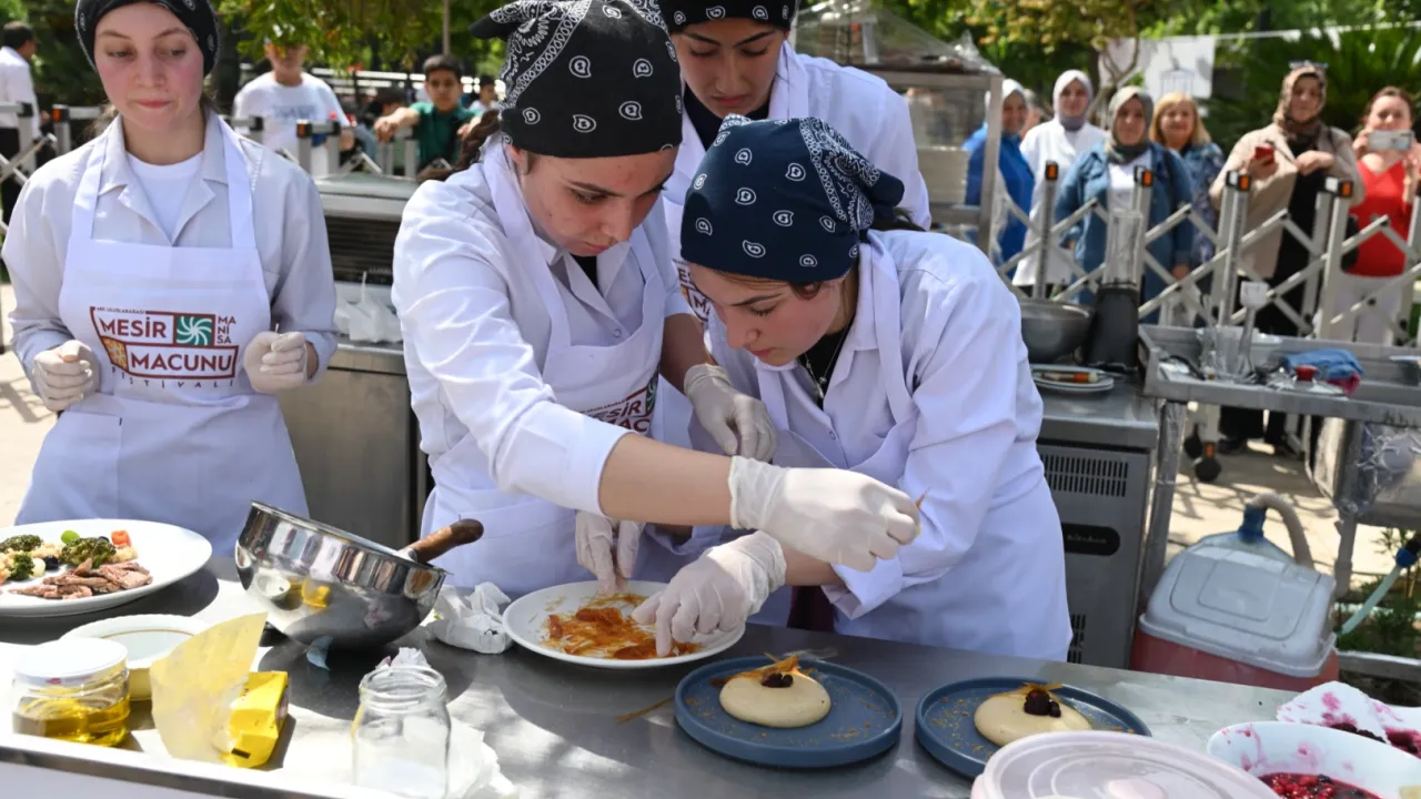 485’inci Uluslararası Manisa Mesir Macunu Festivali Gastronomi Panayırı’nda Liseler Arası Yemek Yarışması düzenlendi. Manisa’nın yöresel tescilli ürünleri mesir macunu, asma yaprağı, üzümüyle hazırlanan yemeklerin yarıştığı heyecan ve lezzet dolu yarışmanın kazananı, Salihli Hafsa Sultan Kız Mesleki ve Teknik Anadolu Lisesi oldu.MANİSA (İGFA) - Bülent Koşmaz Parkı’nda kurulan Gastrononi Panayırı, keyifli bir organizasyona sahne oldu. Meslek liselerinde yemek alanında eğitim gören öğrencilerinden oluşan takımlar, en güzel yemeği yapmak için mücadele etti. Jüri değerlendirmesi sonrası Salihli Hafsa Sultan Kız Mesleki ve Teknik Anadolu Lisesi birinci, Gördes Mesleki ve Teknik Anadolu Lisesi ikinci, Demirci Gevher Nesibe Mesleki ve Teknik Anadolu Lisesi üçüncü, Zeynep Gülin Öngör Kız Mesleki ve Anadolu Teknik Lisesi dördüncü oldu.