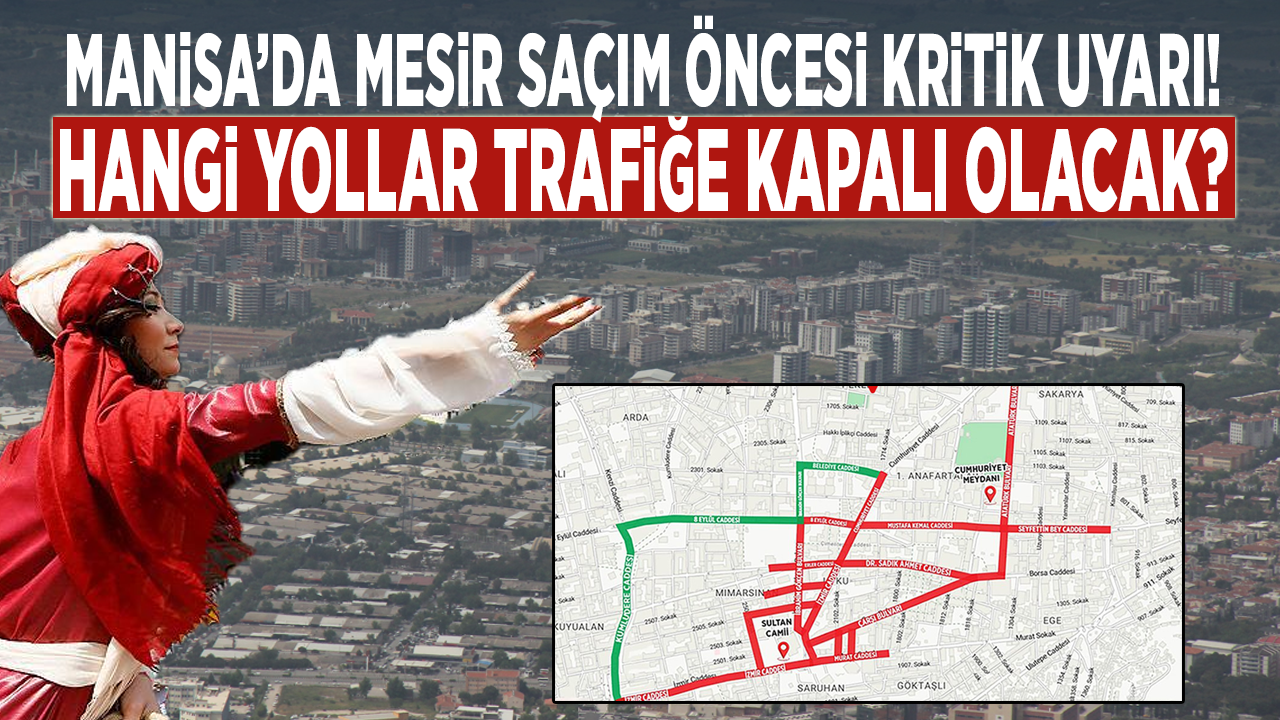 26 Nisan 2026 Pazar günü gerçekleştirilecek olan Mesir Saçım Şenliği etkinlikleri kapsamında, saat 12.00'de kortej yürüyüşü başlayacak ve ardından saat 13.30'da Sultan Camii'nden geleneksel Mesir Saçımı gerçekleştirilecek. Kortej yürüyüşü, Valilik önünden başlayarak Mustafa Kemal Paşa Caddesi, 15 Temmuz Demokrasi Meydanı ve İzmir Caddesi üzerinden Sultan Camii önünde sona erecek. Bu etkinlikler nedeniyle, 25 Nisan 2026 Cumartesi günü saat 14.30’dan sonra belirli yollar üzerinde park yasağı uygulanacak. 26 Nisan 2026 Pazar günü saat 08.00 itibariyle ise belirtilen yollar etkinlik bitimine kadar trafiğe kapatılacak.