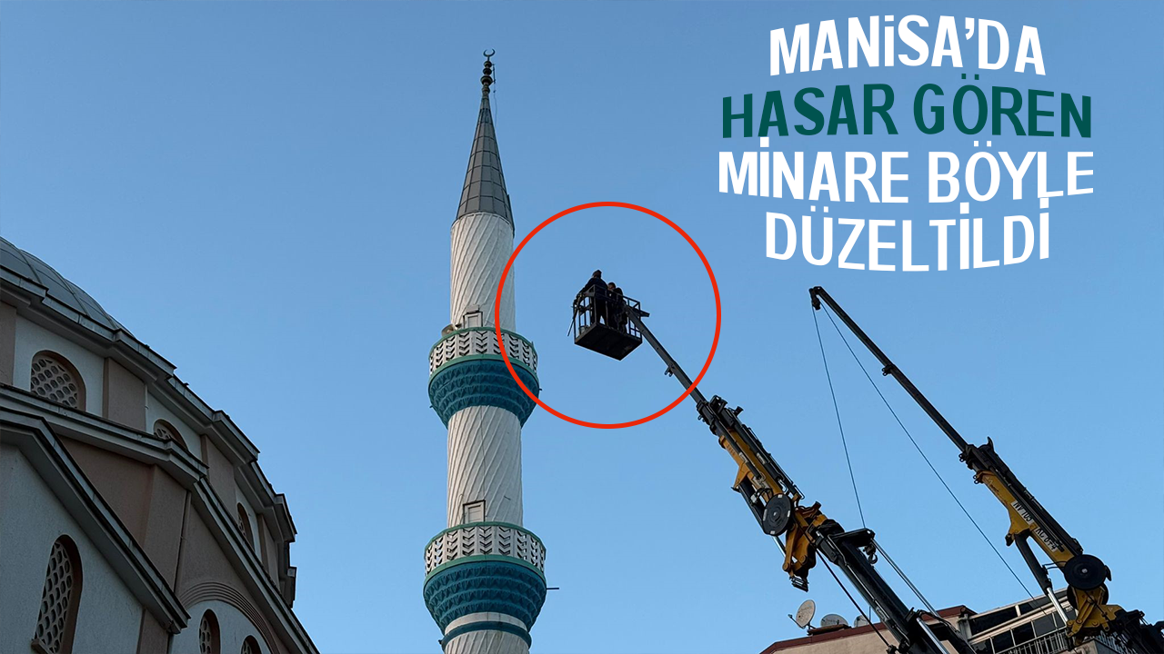 Manisa'da minaresi hasar gören caminin minaresi vinçle düzeltildi