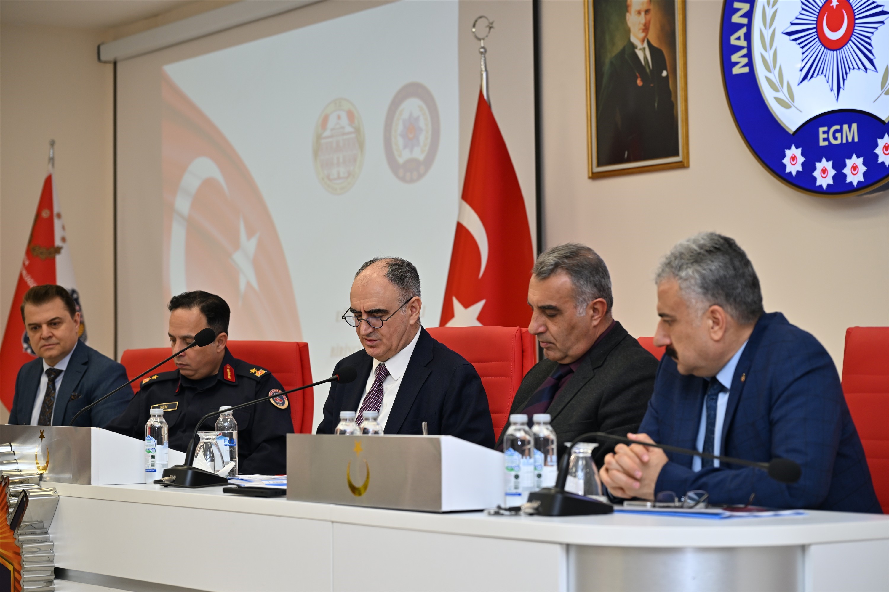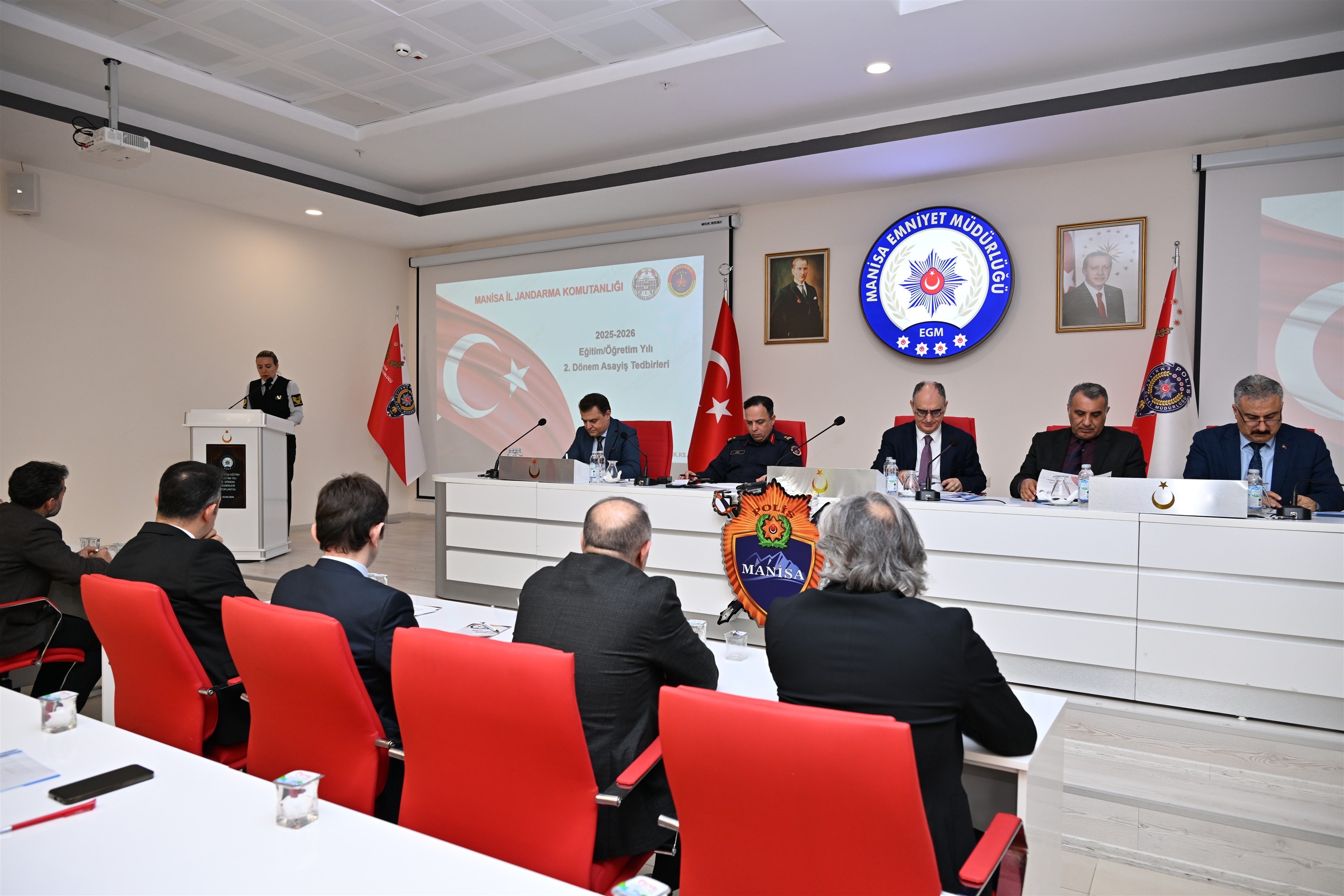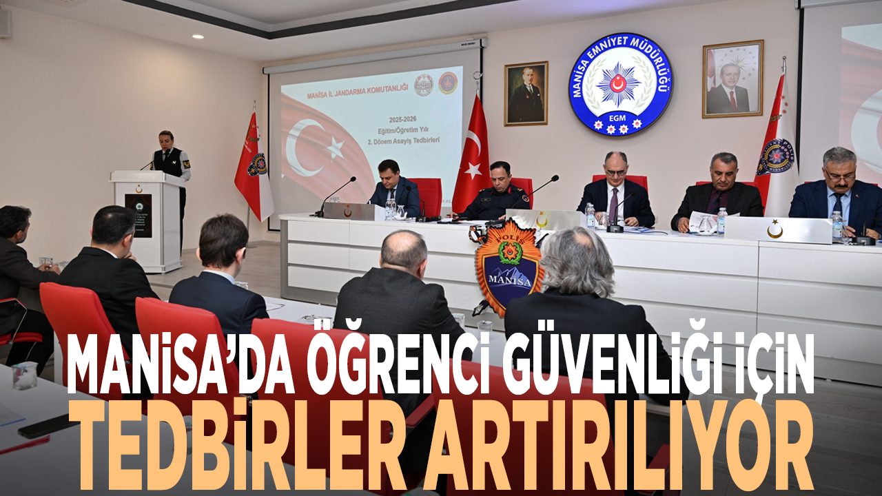 Manisa'da 2025-2026 eğitim öğretim yılının ikinci döneminin başlamasıyla birlikte, okul çevrelerindeki güvenlik ve trafik tedbirleri gözden geçirildi, alınacak önlemler değerlendirildi. Vali Vahdettin Özkan, riskli alanlara yönelik ilave tedbirlerin hayata geçirileceğini belirterek, öğrencilerin huzur ve güven ortamında eğitimlerini sürdürmelerinin en temel öncelik olduğunu vurguladı. Vali Vahdettin Özkan başkanlığında gerçekleştirilen toplantıya; İl Jandarma Komutanı Tuğgeneral İlhan Şen, Vali Yardımcıları Mustafa Harputlu ve Erhan Günay, İl Emniyet Müdürü Fahri Aktaş, İl Millî Eğitim Müdürü Mehmet Uğurelli ile ilgili kurum ve kuruluşların temsilcileri katıldı.
