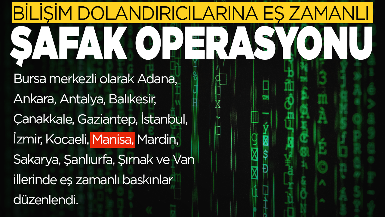 Bursa Emniyet Müdürlüğü Siber Suçlarla Mücadele Şube Müdürlüğü ile İstihbarat Şube Müdürlüğü ekipleri, bilişim sistemleri üzerinden yapılan nitelikli dolandırıcılık olaylarına yönelik geniş çaplı bir operasyonda aralarında Manisa'nın da bulunduğu 16 ilde 40 şüpheliyi gözaltına aldı.