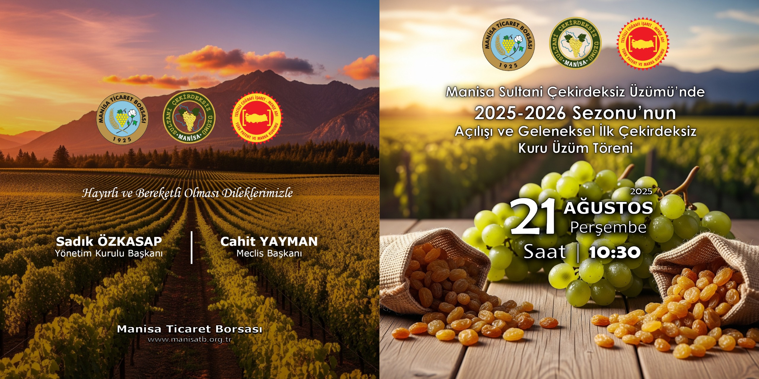 Manisa Ticaret Borsası, kentin en önemli tarımsal ürünlerinden biri olan Sultani Çekirdeksiz Üzümünde 2025-2026 sezonunun açılışı ve Geleneksel İlk Çekirdeksiz Kuru Üzüm Töreni için geri sayım başladı.