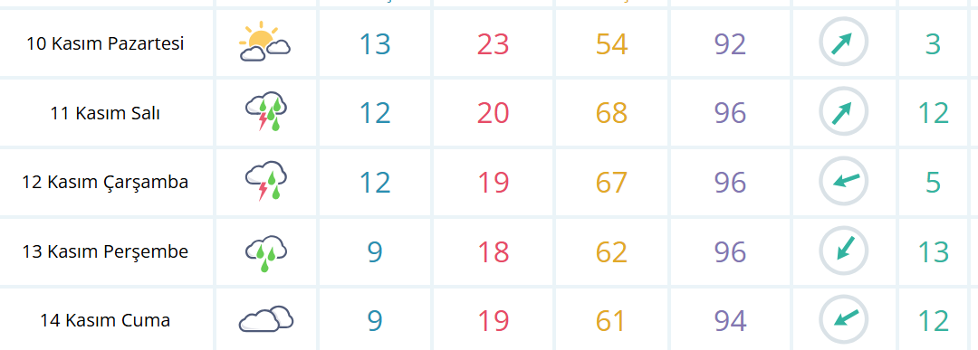Hava durumuna göre yağışlar 11 Kasım Salı gününden itibaren etkisini gösterecek. Salı günü kuvvetli gök gürültülü sağanak yağış bekleniyor. Sıcaklıkların 12 ile 20 derece arasında olacağı tahmin edilirken, rüzgarın yer yer 12 km/sa hızla etkili olması öngörülüyor.