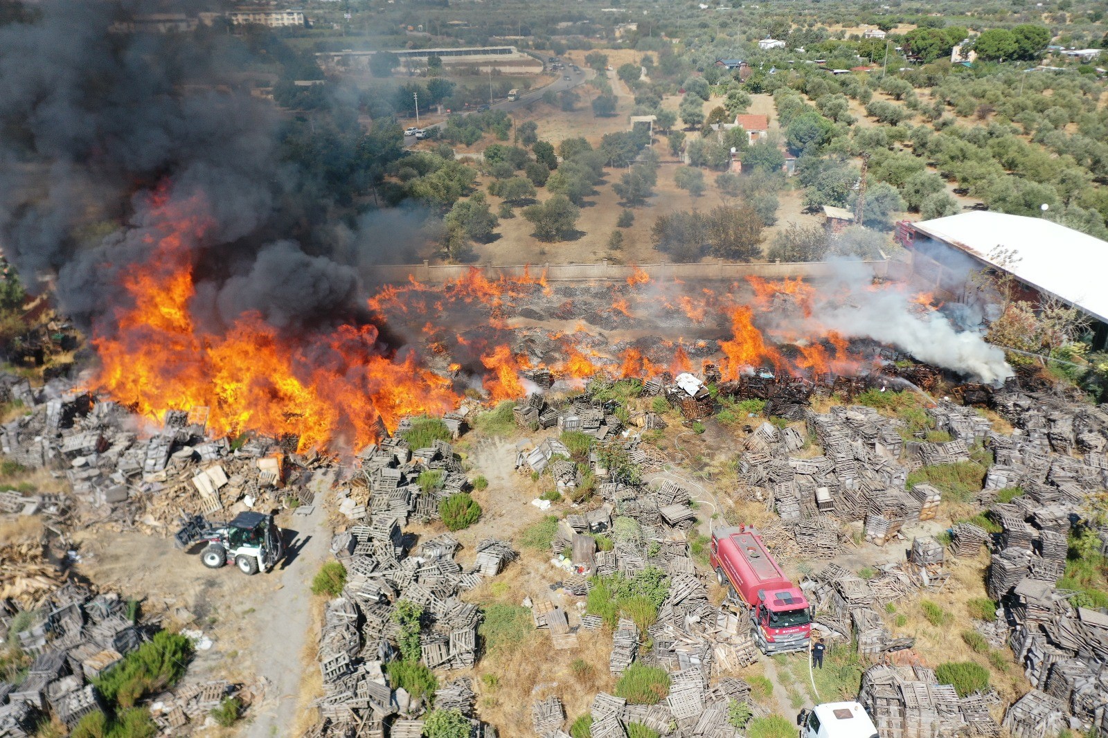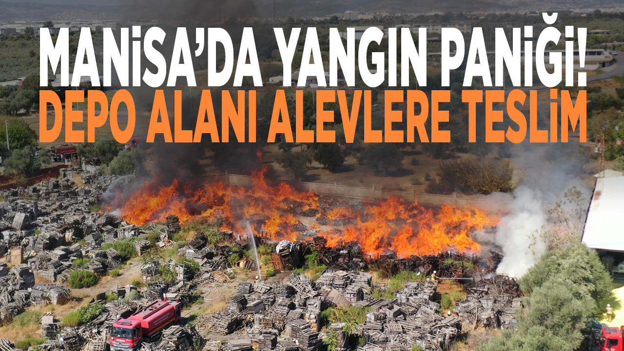 Manisa'nın Yunusemre ilçesi eski Muradiye Mahalle yolunda faaliyet gösteren ahşap palet fabrikasının depo alanında çıkan yangına itfaiye ekiplerinin müdahalesi devam ediyor. Yangına çok sayıda itfaiye ekibi sevk edilirken bölgede sağlık ekipleri de yaşanabilecek bir olumsuzluğa karşı hazır bekletiliyor. Yangını söndürmek için ekiplerin çalışması devam ederken yangın havadan görüntülendi. Görüntülerde depo alanının neredeyse yarısının alevlere teslim olduğu görülüyor.