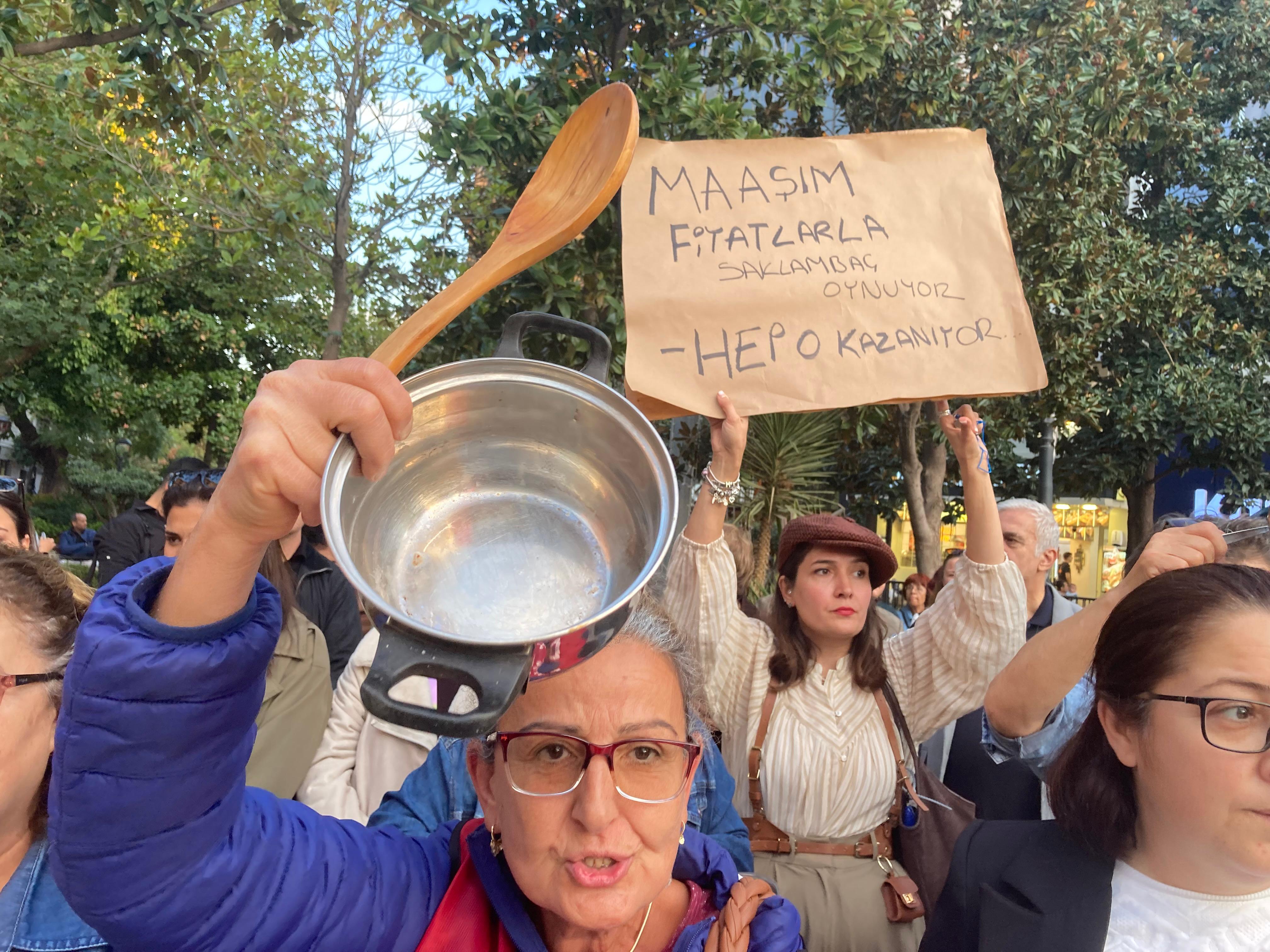 Katılımcılar, ellerindeki tencereleri birbirine vurarak ekonomik sıkıntılara tepki gösterirken, çevredeki vatandaşlar da eyleme alkışlarla destek verdi.