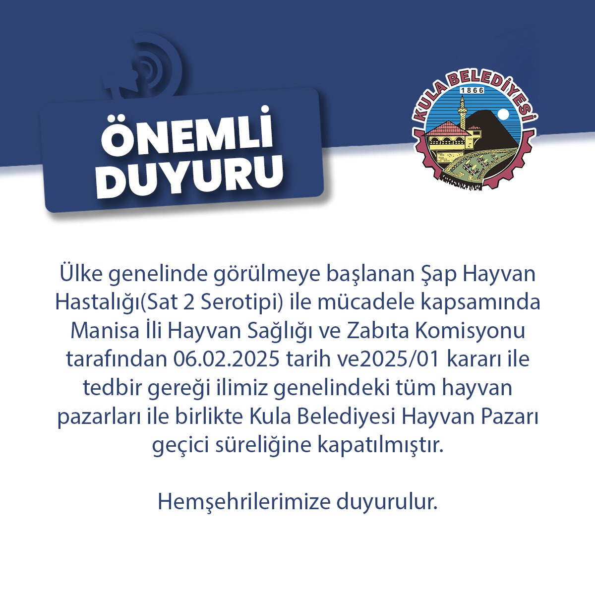 "Ülke genelinde görülmeye başlanan şap hayvan hastalığı (Sat 2 Serotipi) ile mücadele kapsamında Manisa ili Hayvan Sağlığı ve zabıta Komisyonu tarafından 06.02.2025 tarih ve 2025/01 kararı ile tedbir gereği elimiz genelindeki tüm hayvan pazarları ile birlikte Kula Belediyesi hayvan pazarı geçici süreliğine kapatılmıştır."