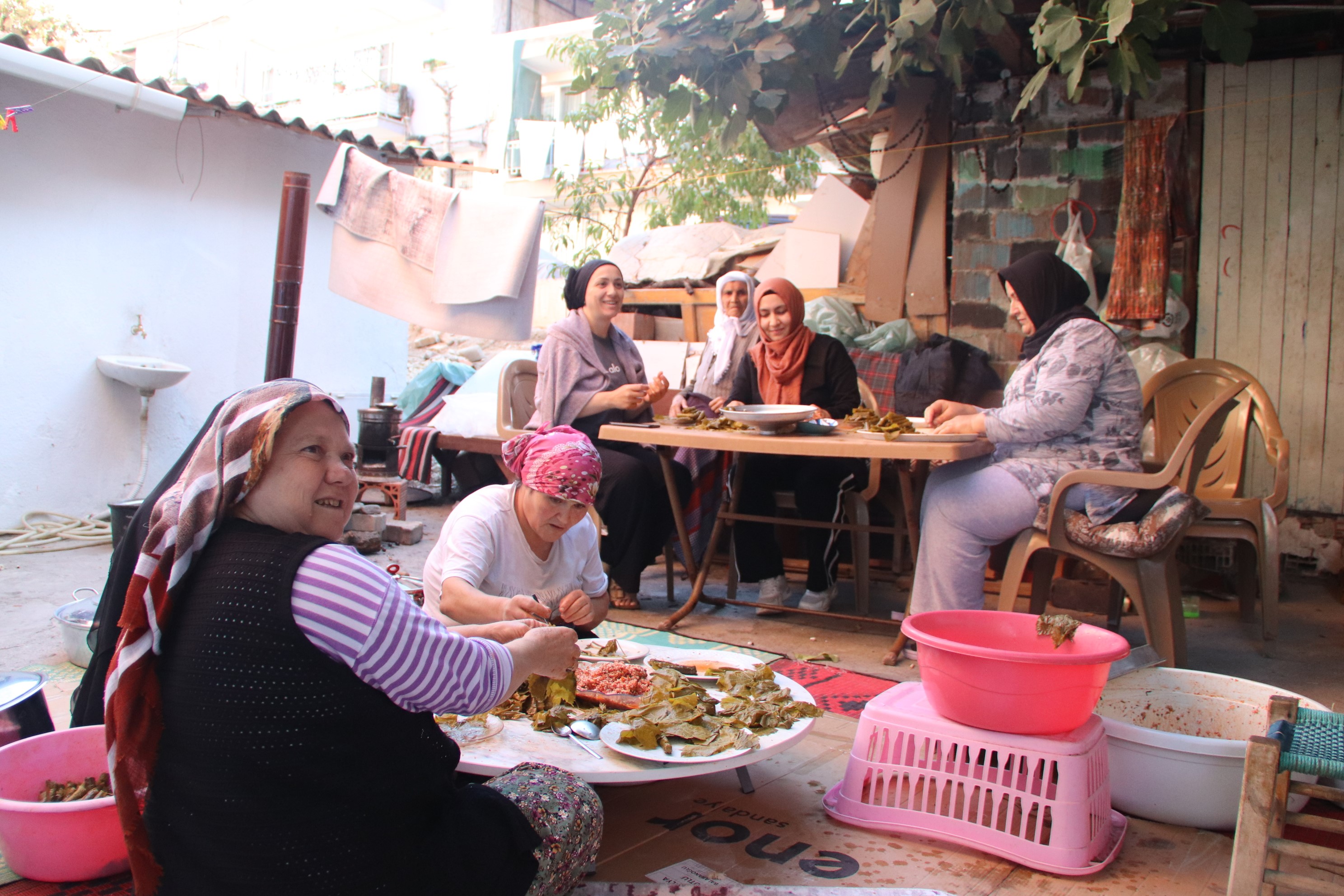 Turgutlu ilçesi Selvilitepe Mahallesinde bir araya gelen mahalle sakinleri toplandıkları bir komşularını evinin bahçesinde sarma sararak Gazze'ye destek amaçlı düzenlenen hayır panayırlarına gönderiyor.