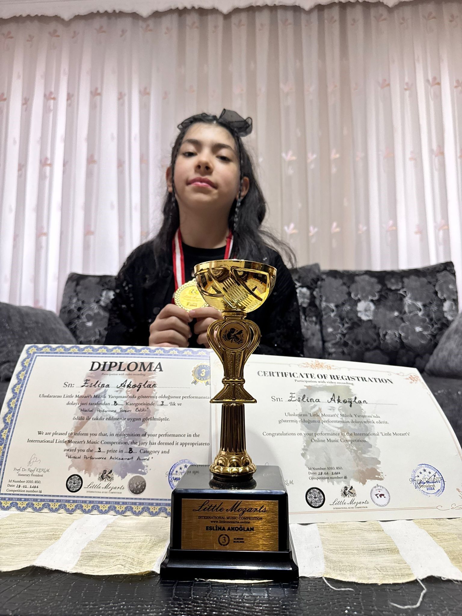 MANİSA (İHA) - Manisa’da eğitim hayatını sürdüren başarılı öğrenci Eslina Akoğlan, 28 Şubat 2026 tarihinde düzenlenen 16. Uluslararası Little Mozart’s Online Müzik Yarışması’nda önemli bir başarıya imza attı. Yarışmada B kategorisinde üçüncülük elde eden Akoğlan, ayrıca "Müzikal Performans Başarı Ödülü"nün de sahibi oldu.