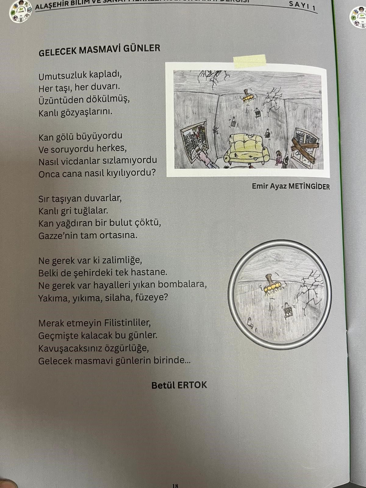 Manisa’nın Alaşehir ilçesinde, Alaşehir Bilim ve Sanat Merkezi öğrencileri tarafından Filistin temalı şiirlerden oluşan "Düşten Beri" adlı derginin tanıtımı yapıldı. Düzenlenen programda öğrencilerin Filistin için kaleme aldığı şiirler okunurken, Filistin’e destek mesajları verildi.