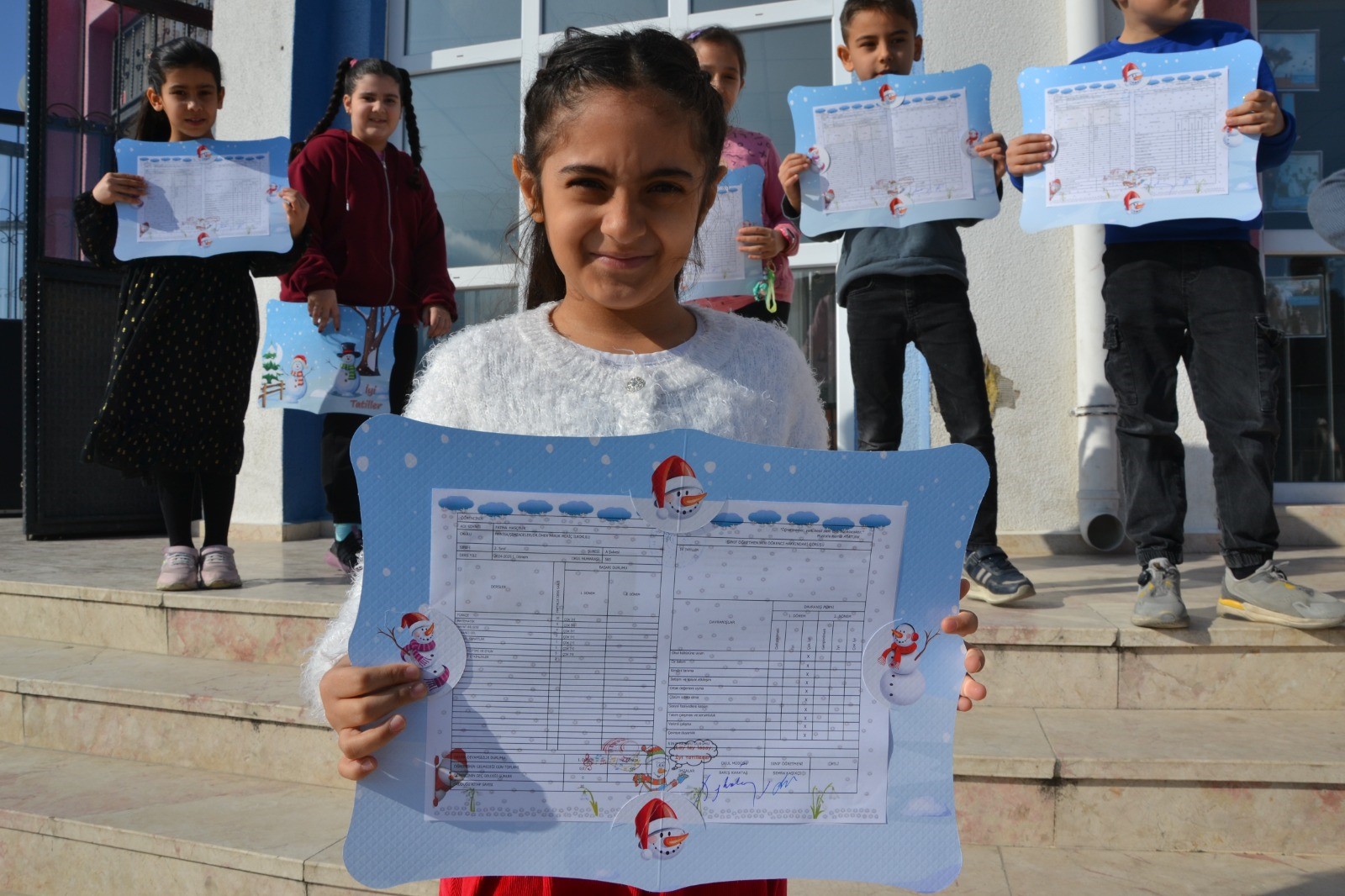Karne alan minik öğrencilerin mutluluğu yüzlerinden okunuyordu. Dr. Ömer Faruk Meriç İlkokulu’nda 750 öğrenci karne aldı.