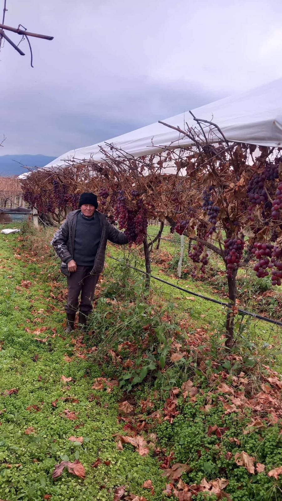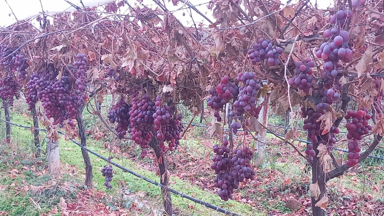Bağında 10 asma Red Globe üzümü ayıran Osman Tosun, üzümlerini sezonunda kilosu 30 liradan sattıktan sonra bir kısmını dalında bekletmeye başladı. Asmalarda yaprakların neredeyse tamamen dökülmesine rağmen üzümlerin dalında sağlam ve taze kalması dikkat çekti.