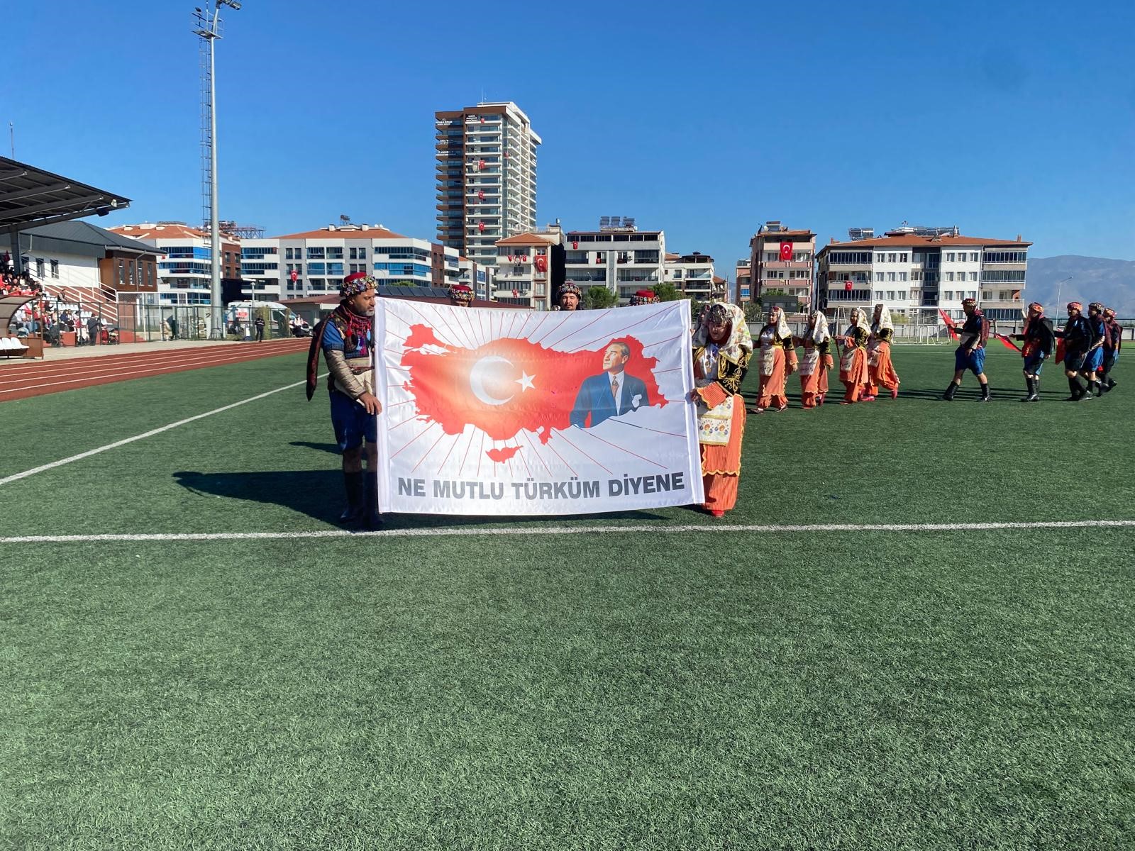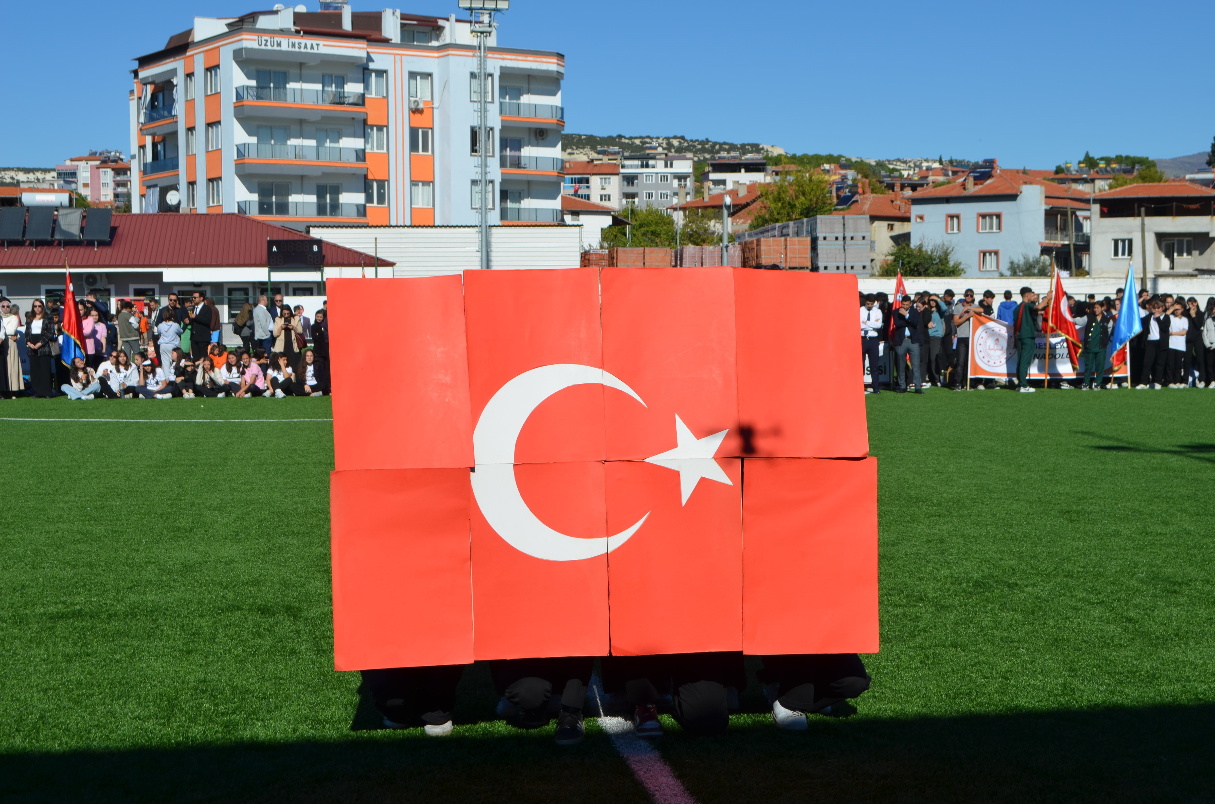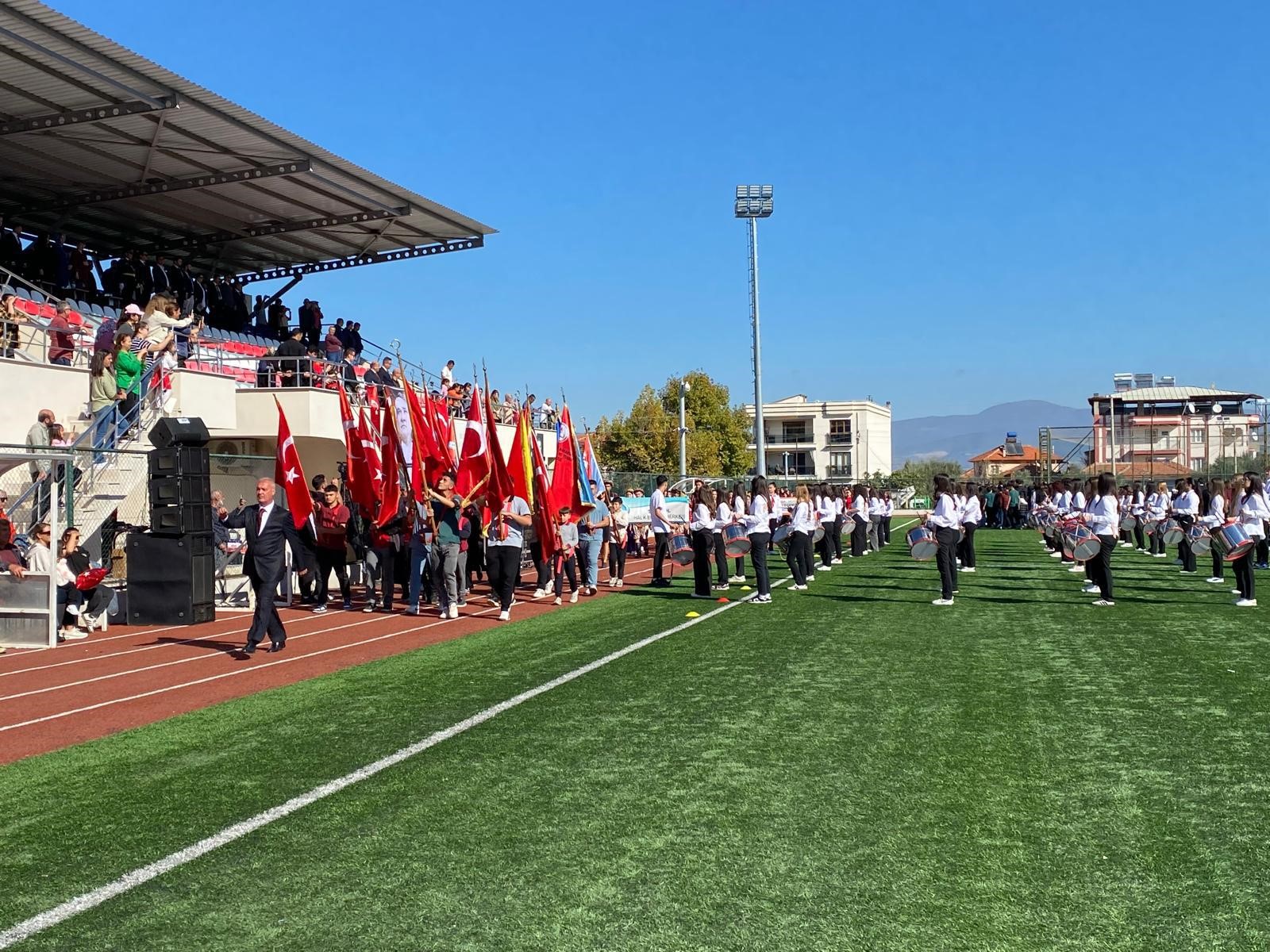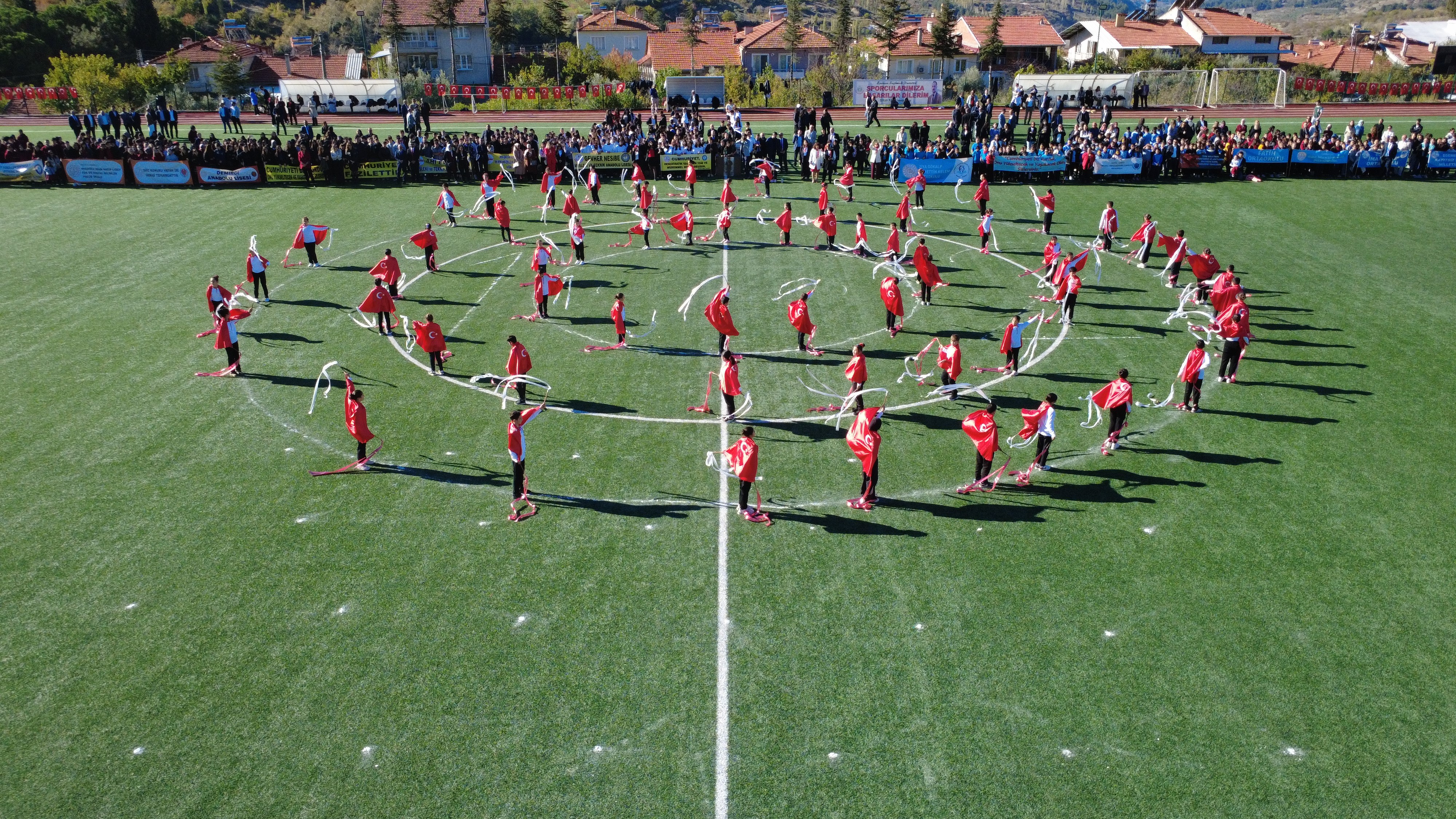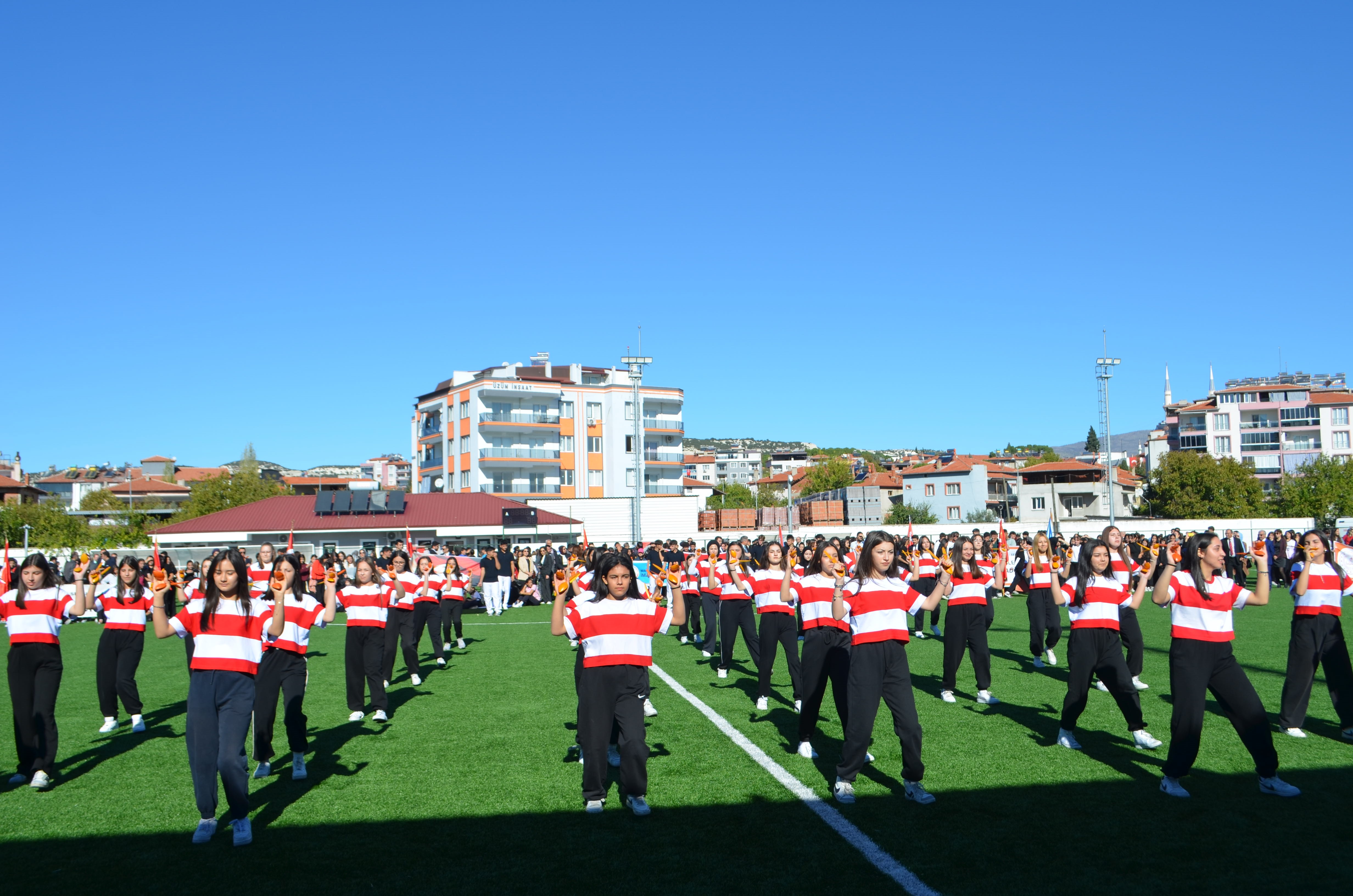 Gevher Nesibe Mesleki ve Teknik Anadolu Lisesi ve 75. Yıl Alime Paşa Ortaokulu öğrencileri bedenleri ile gösteriler kapsamında stada 102 ve Ayyıldız koreografisini çizdiler. Törende Kaymakam Fatih Bayram, Belediye Başkanı Erkan Kara ve Garnizon Komutanı Mly. Binbaşı Hüseyin Cihan Korkmaz tarafından 29 Ekim Cumhuriyet Bayramı dolayısıyla ilçede düzenlenen okullar arası yarışmalarda dereceye giren öğrencilere ödülleri verildi.