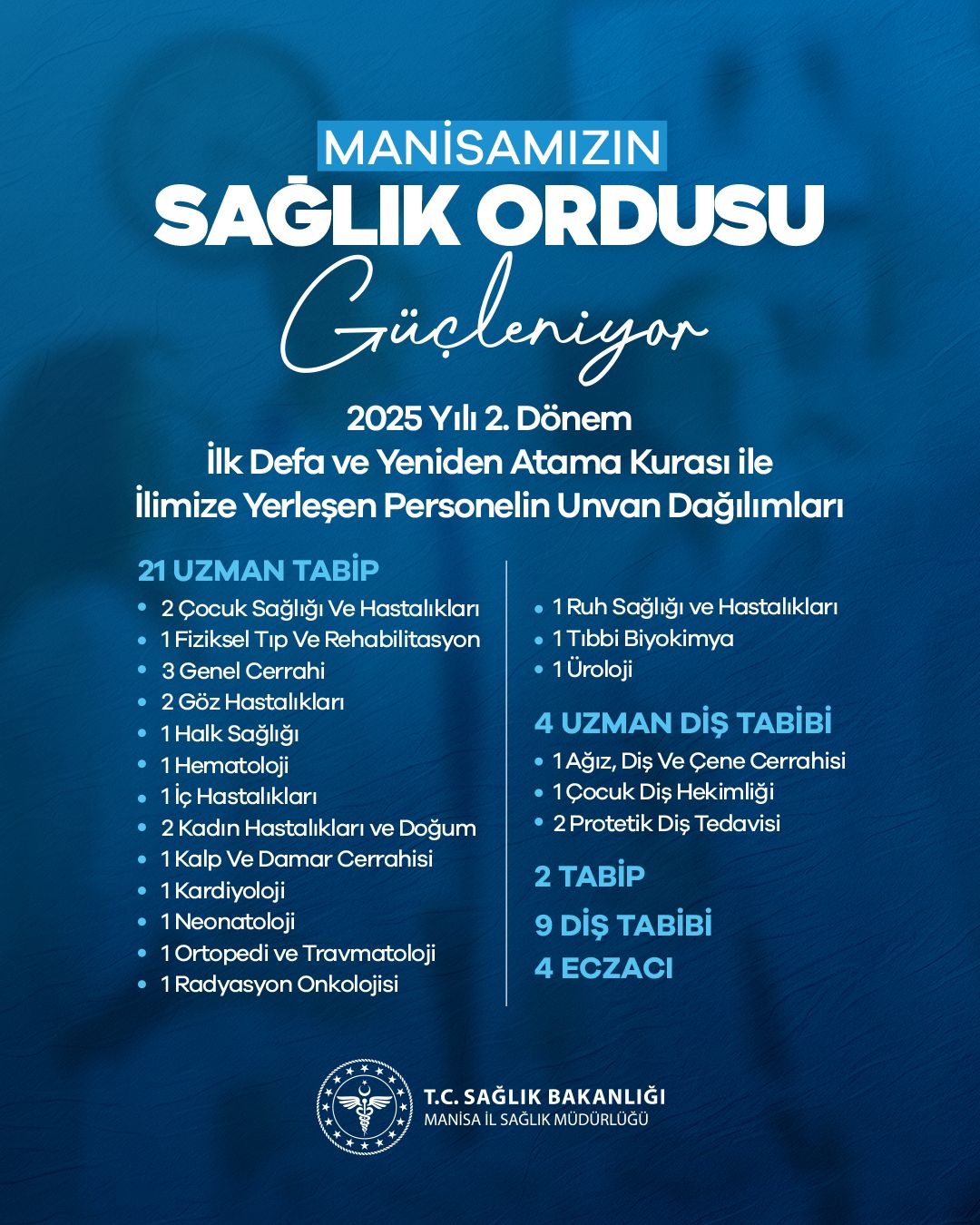 “Cumhurbaşkanımız Sayın Recep Tayyip Erdoğan’ın liderliğinde, insanı merkeze alan hizmet anlayışının en güzel yansımalarından biri de sağlık alanında yaşanıyor. 2025 yılı 2. dönem atamalarıyla; 21 uzman tabip, 4 uzman diş tabibi, 9 diş tabibi, 2 tabip ve 4 eczacı daha Manisa’mıza kazandırıldı.
