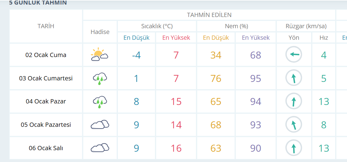 Hafta başından itibaren ise hava sıcaklıklarında hissedilir bir artış yaşanacak. 04 Ocak Pazar günü sıcaklıkların 15 dereceye kadar yükselmesi beklenirken, yağışlı havanın etkisini sürdüreceği bildirildi. Pazartesi ve Salı günleri ise çok bulutlu bir gökyüzü beklenirken, termometrelerin 16 dereceye kadar çıkacağı tahmin ediliyor. Özellikle Cuma günü yaşanacak eksi dereceli soğukların ardından gelen bu ani sıcaklık değişimlerine karşı uzmanlar, vatandaşları dikkatli olmaları konusunda uyarıyor.