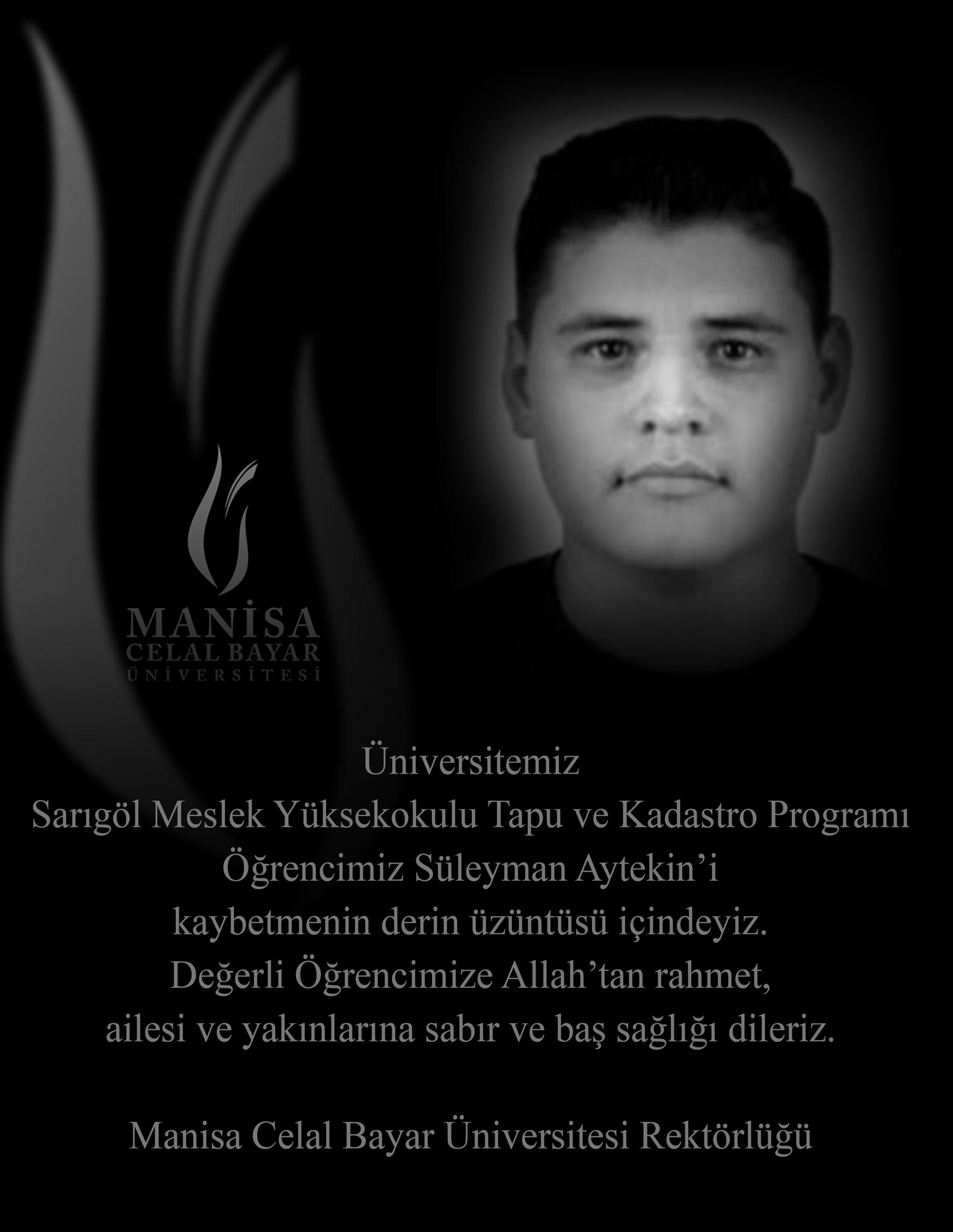 Manisa Celal Bayar Üniversitesi Sarıgöl Meslek Yüksekokulu Tapu ve Kadastro Programı öğrencisi Süleyman Aytekin’in yaşamını yitirdiği açıklandı. Genç öğrencinin vefatı, üniversite topluluğunda ve ailesi başta olmak üzere tüm yakın çevresinde büyük üzüntüye neden oldu.