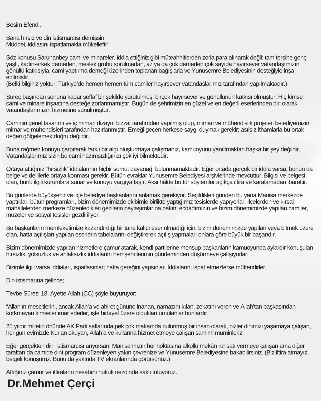 “Besim Efendi, bana hırsız ve din istismarcısı demişsin. Müddei, iddiasını ispatlamakla mükelleftir.Söz konusu Saruhanbey cami ve minareler, iddia ettiğiniz gibi müteahhitlerden zorla para alınarak değil; tam tersine genç-yaşlı, kadın-erkek demeden, meslek grubu sorulmadan, az ya da çok demeden çok sayıda hayırsever vatandaşımızın gönüllü katkısıyla, cami yaptırma derneği üzerinden toplanan bağışlarla ve Yunusemre Belediyesinin desteğiyle inşa edilmiştir.