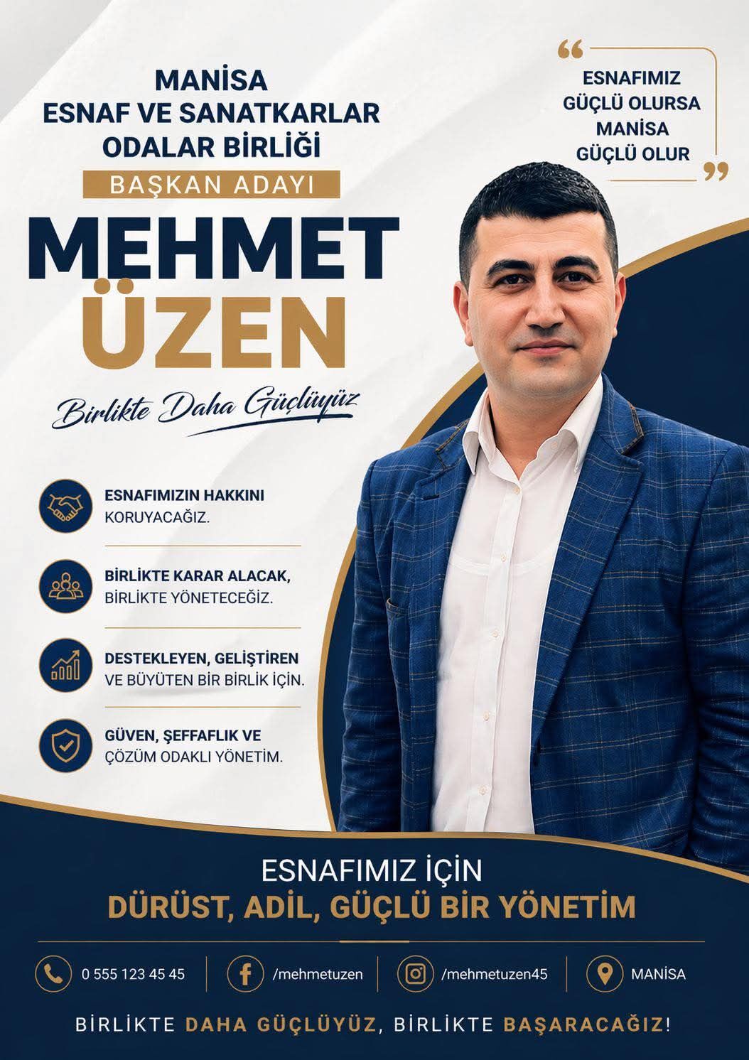 Manisa esnafının merakla beklediği büyük kongreye sayılı günler kala, adaylar saha çalışmalarına hız verdi. Mevcut Başkan Hasan Geriter ile yarışacak olan Manisa Elektronikçiler Odası Başkanı Mehmet Üzen, "Birlikte Daha Güçlüyüz" sloganıyla hazırladığı kampanya görselini paylaşarak yönetim vizyonunu seçmenlerine sundu.