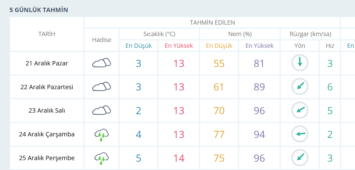 Meteoroloji'den yapılan son tahminlere göre, kent genelinde hava sıcaklıklarının 13–14 derece seviyelerinde seyretmesi öngörülürken, gece sıcaklıklarının 2 ila 5 derece arasında olması bekleniyor.