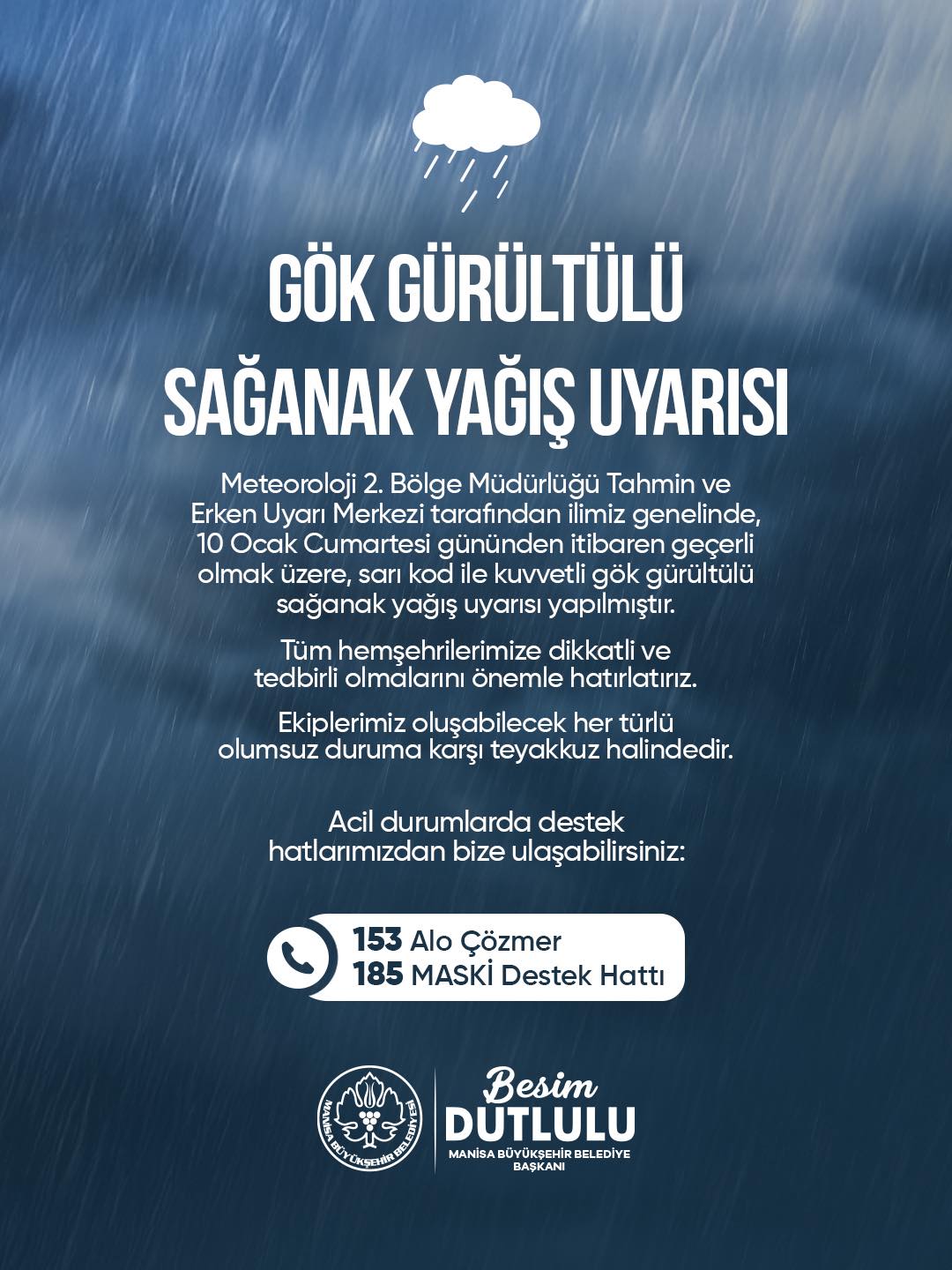 Manisa Büyükşehir Belediye Başkanı Besim Dutlulu imzasıyla yayınlanan uyarı mesajında, belediye ekiplerinin oluşabilecek her türlü olumsuz duruma karşı saha hazırlıklarını tamamladığı ve teyakkuz halinde olduğu belirtildi. Vatandaşların can ve mal güvenliğini korumak amacıyla yapılan açıklamada, tüm hemşehrilerin tedbirli olması gerektiği vurgulandı.