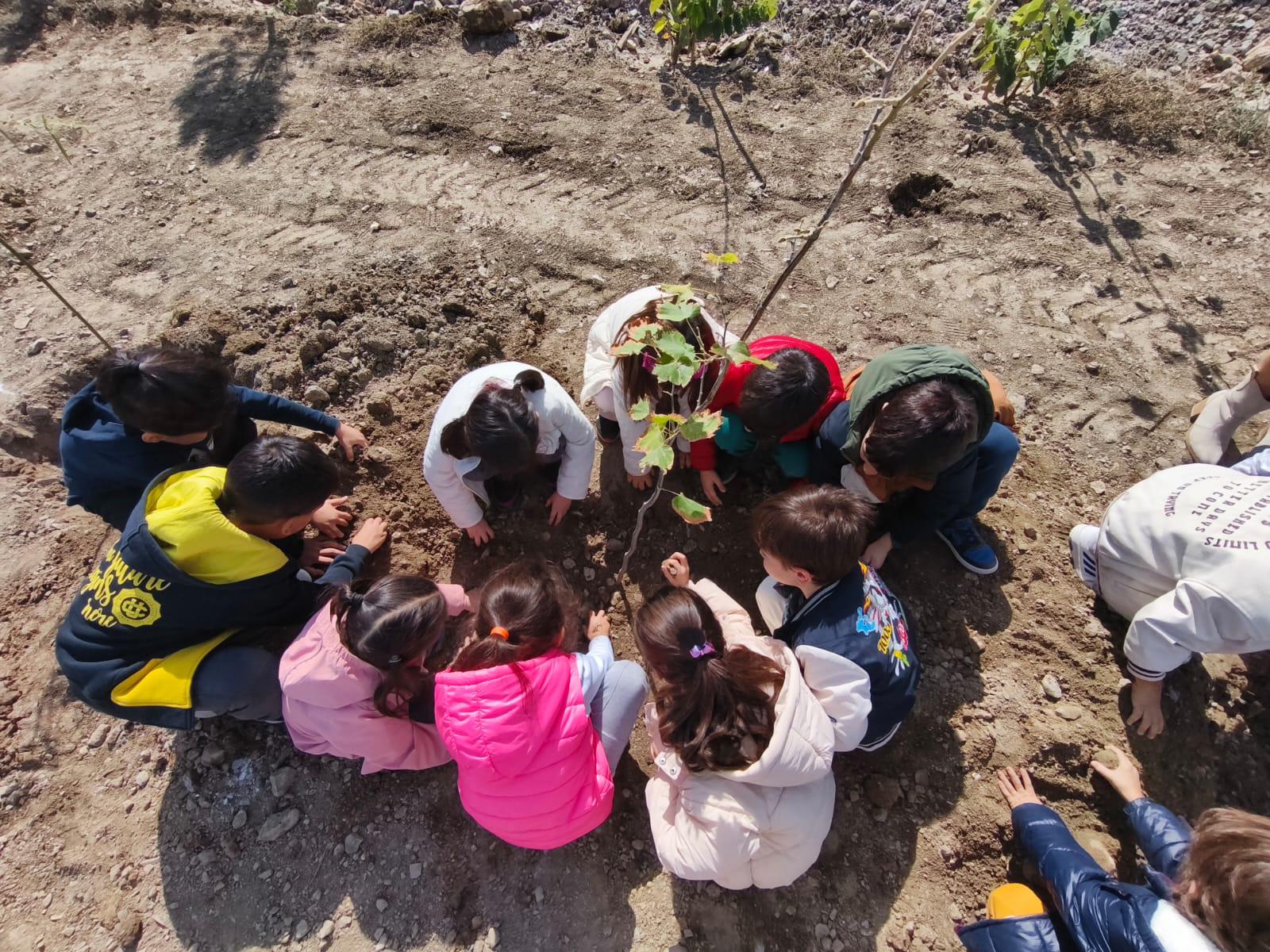 Öğretmenlerinin rehberliğinde, fidanların nasıl dikileceği konusunda bilgi alan öğrencilerimiz kürekleri ve elleriyle toprağı hazırlayarak fidanlarını özenle yerleştirdi.