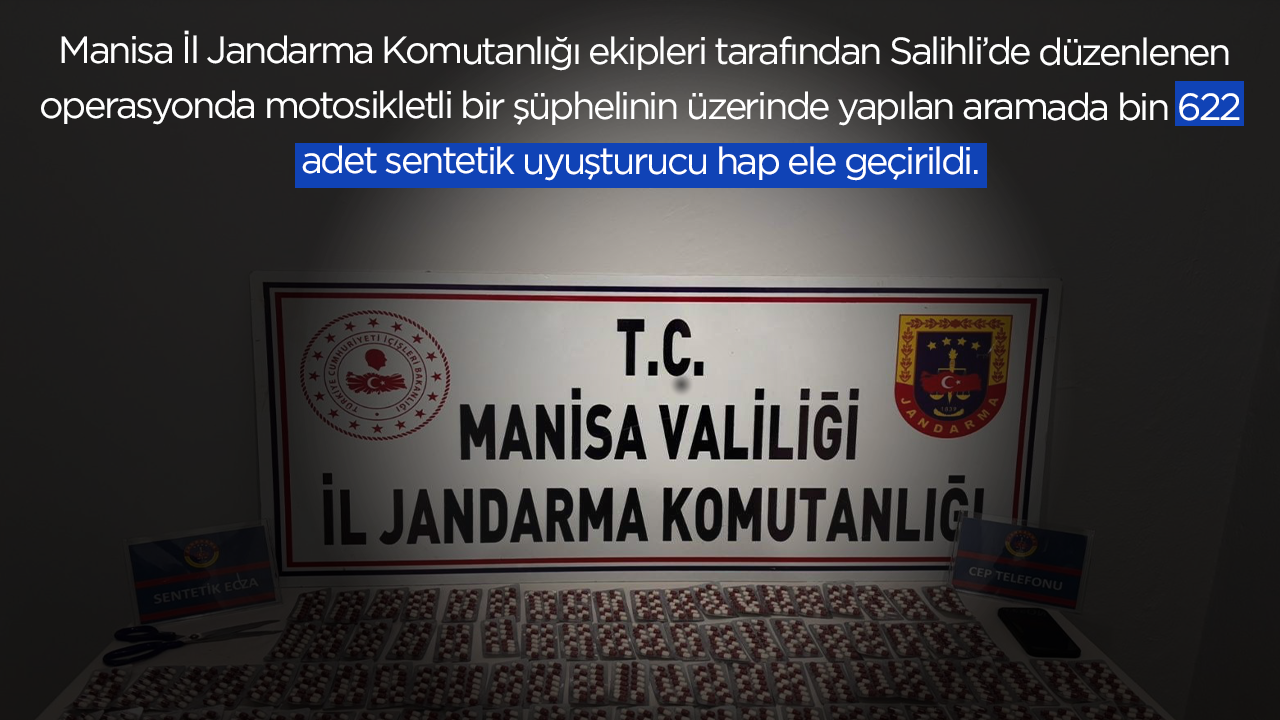 Manisa İl Jandarma Komutanlığı ekipleri tarafından Salihli’de düzenlenen operasyonda motosikletli bir şüphelinin üzerinde yapılan aramada bin 622 adet sentetik uyuşturucu hap ele geçirildi.