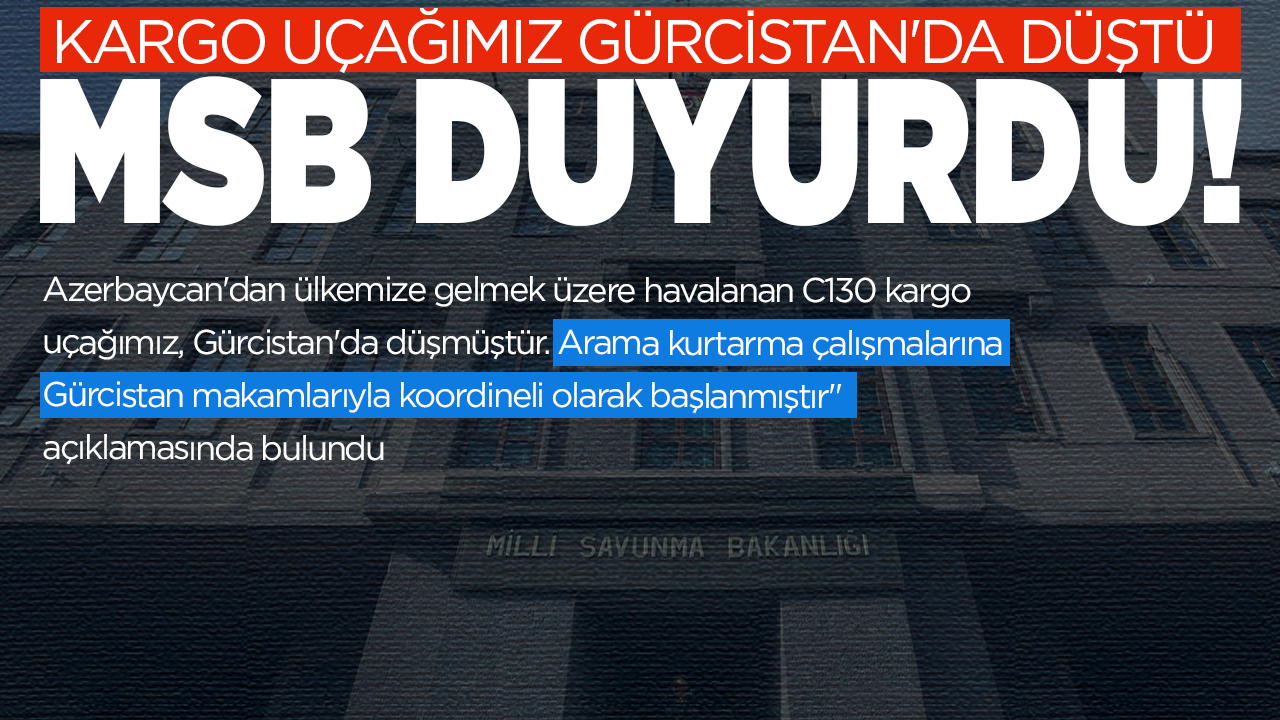Milli Savunma Bakanlığı, "Azerbaycan'dan ülkemize gelmek üzere havalanan C130 kargo uçağımız, Gürcistan'da düşmüştür. Arama kurtarma çalışmalarına Gürcistan makamlarıyla koordineli olarak başlanmıştır" açıklamasında bulundu