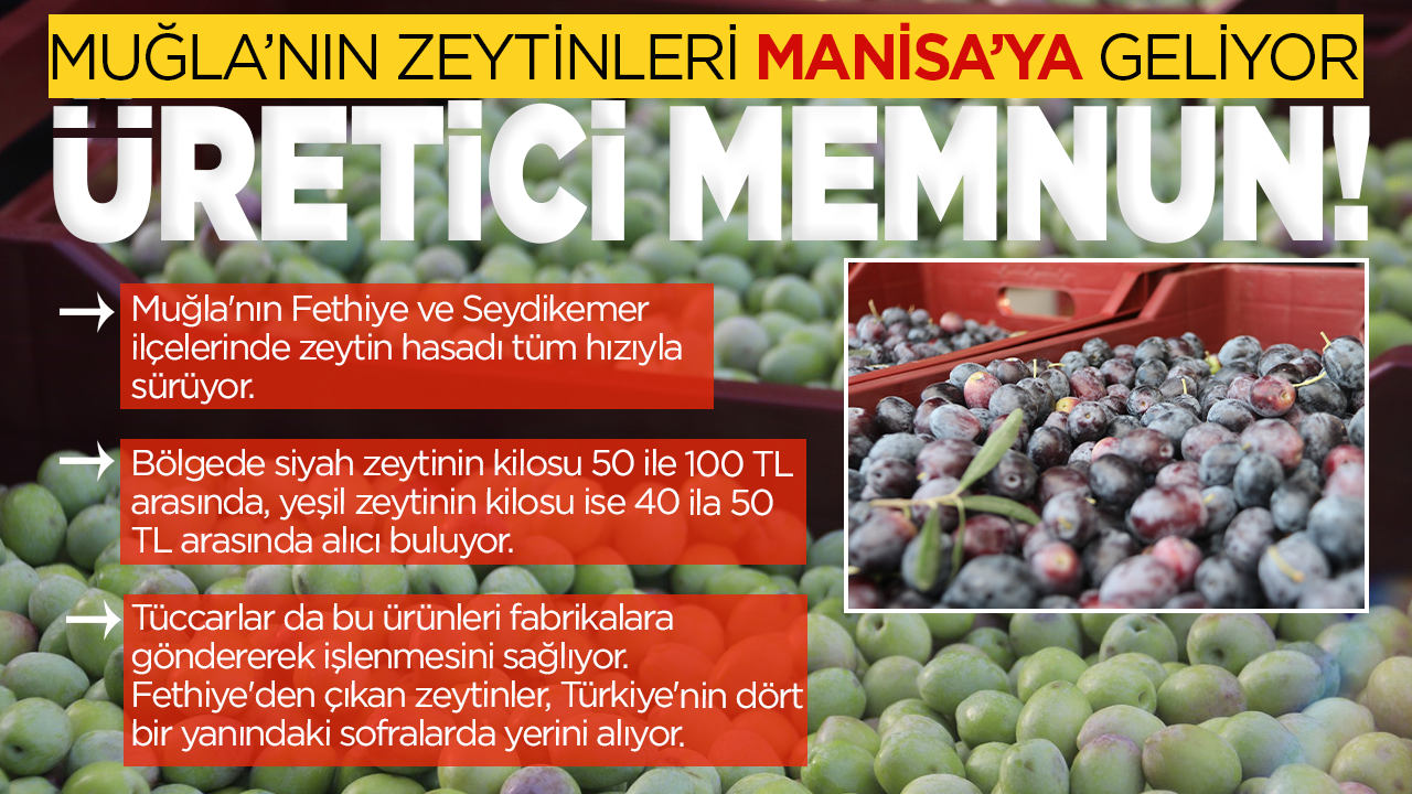 Fethiye ve çevresinde çiftçiler, yıl boyunca büyük emek verdikleri zeytin ağaçlarından mahsullerini toplamaya başladı. Toplanan zeytinler, kalite ve türüne göre sınıflandırılarak tüccarlara satılıyor. Tüccarlar da bu ürünleri fabrikalara göndererek işlenmesini sağlıyor. Fethiye'den çıkan zeytinler, Türkiye'nin dört bir yanındaki sofralarda yerini alıyor. Fethiye'de zeytin ticareti yapan Turgut Can Kuzucu, siyah zeytinin kilosunun 50 ile 100 TL arasında, yeşil zeytinin kilosunun ise 40 ila 50 TL arasında alıcı bulduğunu söyledi.