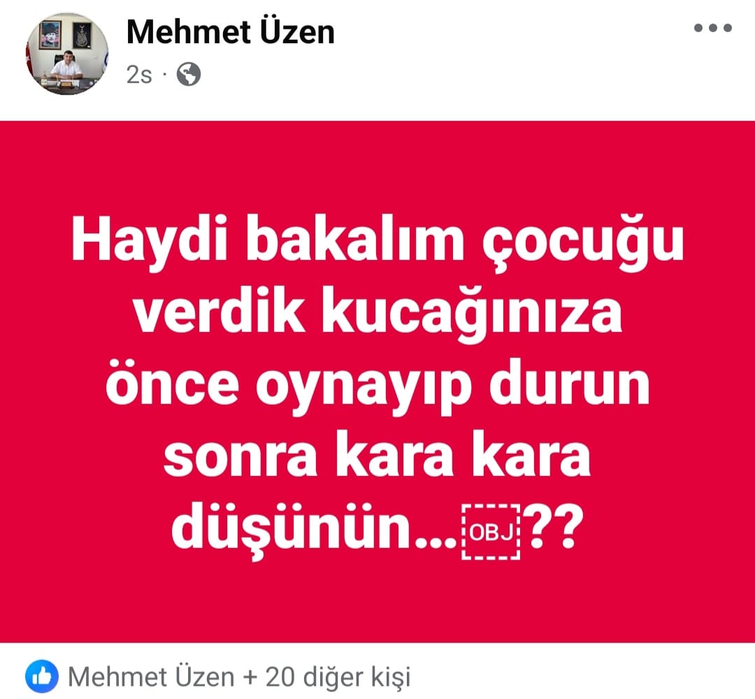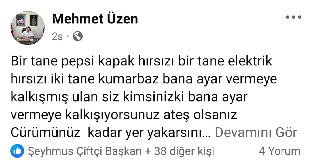Başkan Üzen, bugün sosyal medya hesabından iki ayrı paylaşımda bulundu. İlk paylaşımında “Haydi bakalım çocuğu verdik kucağınıza. Önce oynayıp durun sonra kara kara düşünün” ifadelerini paylaşan Üzen, ardından, “Bir tane Pepsi kapak hırsızı bir tane elektrik hırsızı iki tane kumarbaz bana ayar vermeye kalkışmış. Ulan siz kimsinizki bana ayar vermeye kalkışıyorsunuz? Ateş olsanız cürümünüz kadar yer yakarsınız. Yarası olan beni arayabilir. Telim 7/24 açık” paylaşımında bulundu.