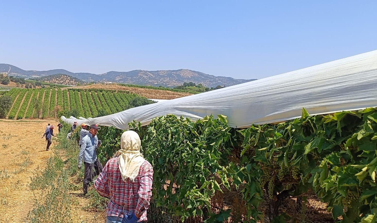 Sarıgöl Ovası’na göre 10-15 gün geç örtü altına alınan bu bölgelerde, hava sıcaklıklarının gölgede 43 dereceyi bulduğu bildirildi. Kavurucu sıcak altında çalışan örtü işçileri, güneşin zararlı etkilerinden korunmak için şapka ve sarık gibi koruyucu aksesuarlar kullanıyor.
