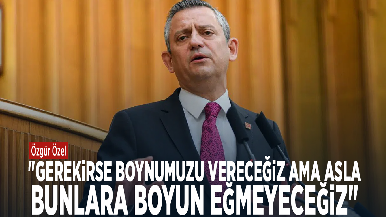 Cumhuriyet Halk Partisi (CHP) Genel Başkanı Özgür Özel, ara seçim çağrısını yineleyerek Cumhıurbaşkanı Recep Tayyip Erdoğan'a seslendi. Özel, "Gerekirse boynumuzu vereceğiz ama asla bunlara boyun eğmeyeceğiz. Türkiye'yi seviyoruz, partimizi seviyoruz. Bu ülkeyi kurtarmak için boynumuz kıldan incedir. Bu ülkeye baş eğdiremeyeceksiniz. Tayyip Erdoğan'a söyleyin; CHP'nin 100 yıl sonra bir kez daha bu ülkeyi kurtarmaya ant içmiş neferleri var, evlatları var" dedi.