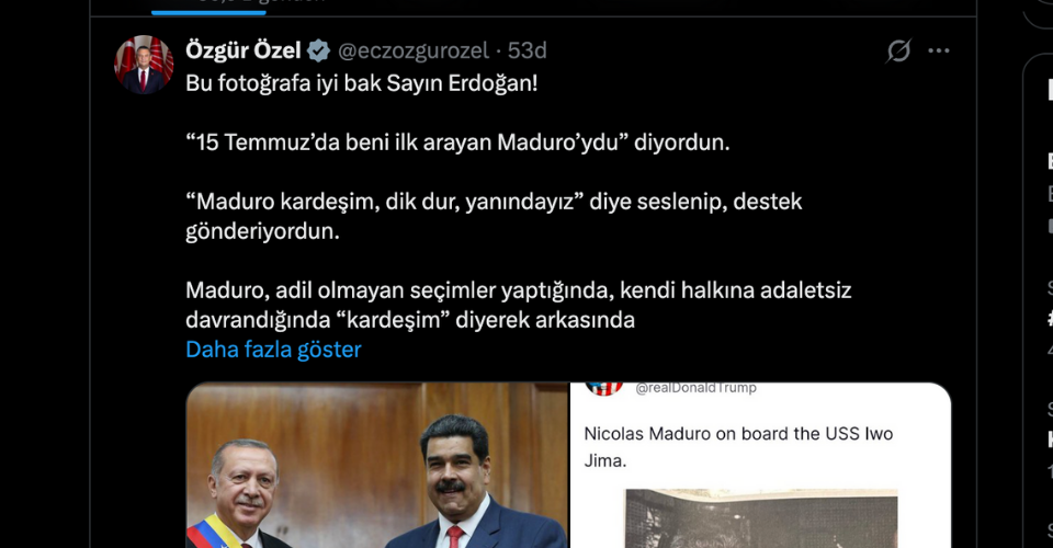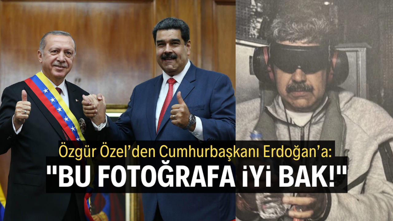 Özel'in paylaştığı ilk fotoğrafta Cumhurbaşkanı ve AKP Genel Başkanı Recep Tayyip Erdoğan ile ABD'nin gece saatlerinde Venezuela'ya düzenlediği operasyonda yakalayarak ülke dışına çıkarttığı Devlet Başkanı Nicolas Maduro yer alıyor.