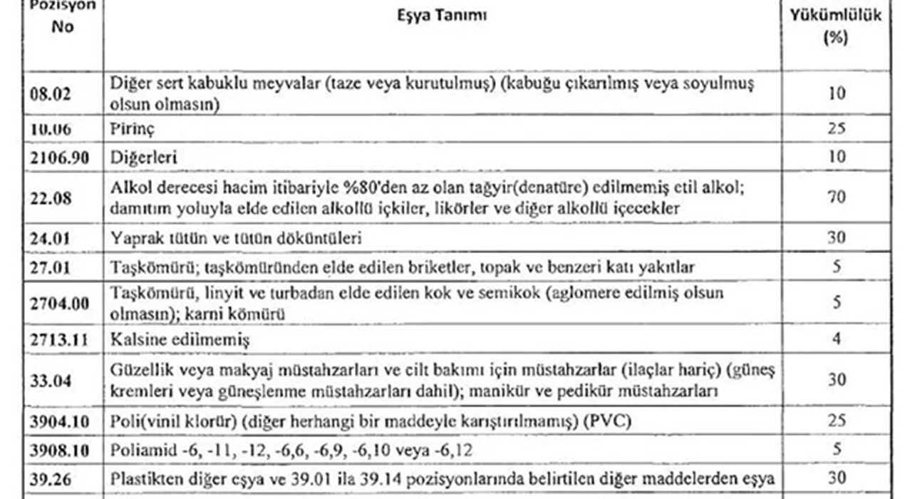 Ek vergi getirilen ürünler arasında alkollü içecekler, otomobil, makyaj malzemeleri ve yaprak tütünleri de vardı.