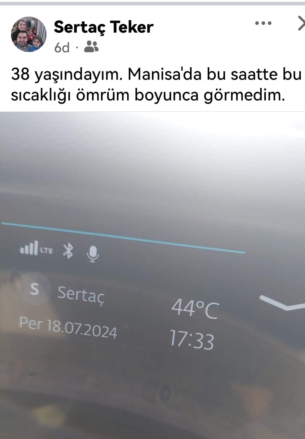 Manisa’nın tanına siması Sertaç Teker Teker, sıcaklık değerini şu sözlerle paylaştı: “38 yaşındayım, Manisa’da bu sıcaklık değerini ömrüm boyunca görmedim.”