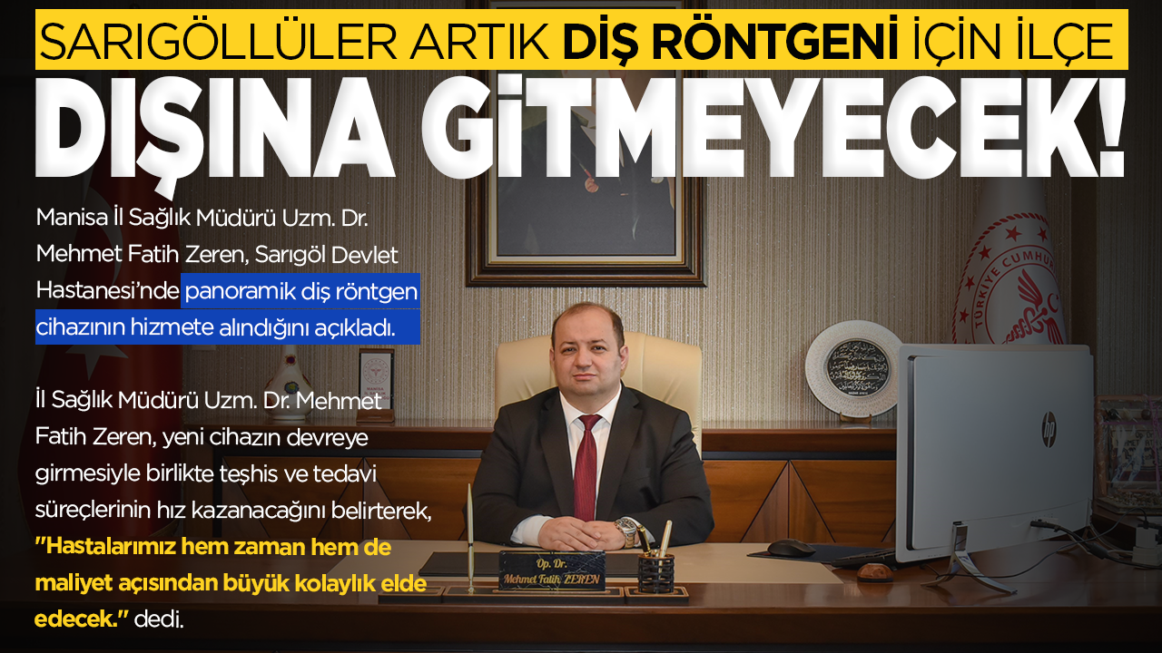Manisa İl Sağlık Müdürü Uzm. Dr. Mehmet Fatih Zeren, Sarıgöl Devlet Hastanesi’nde panoramik diş röntgen cihazının hizmete alındığını açıkladı.