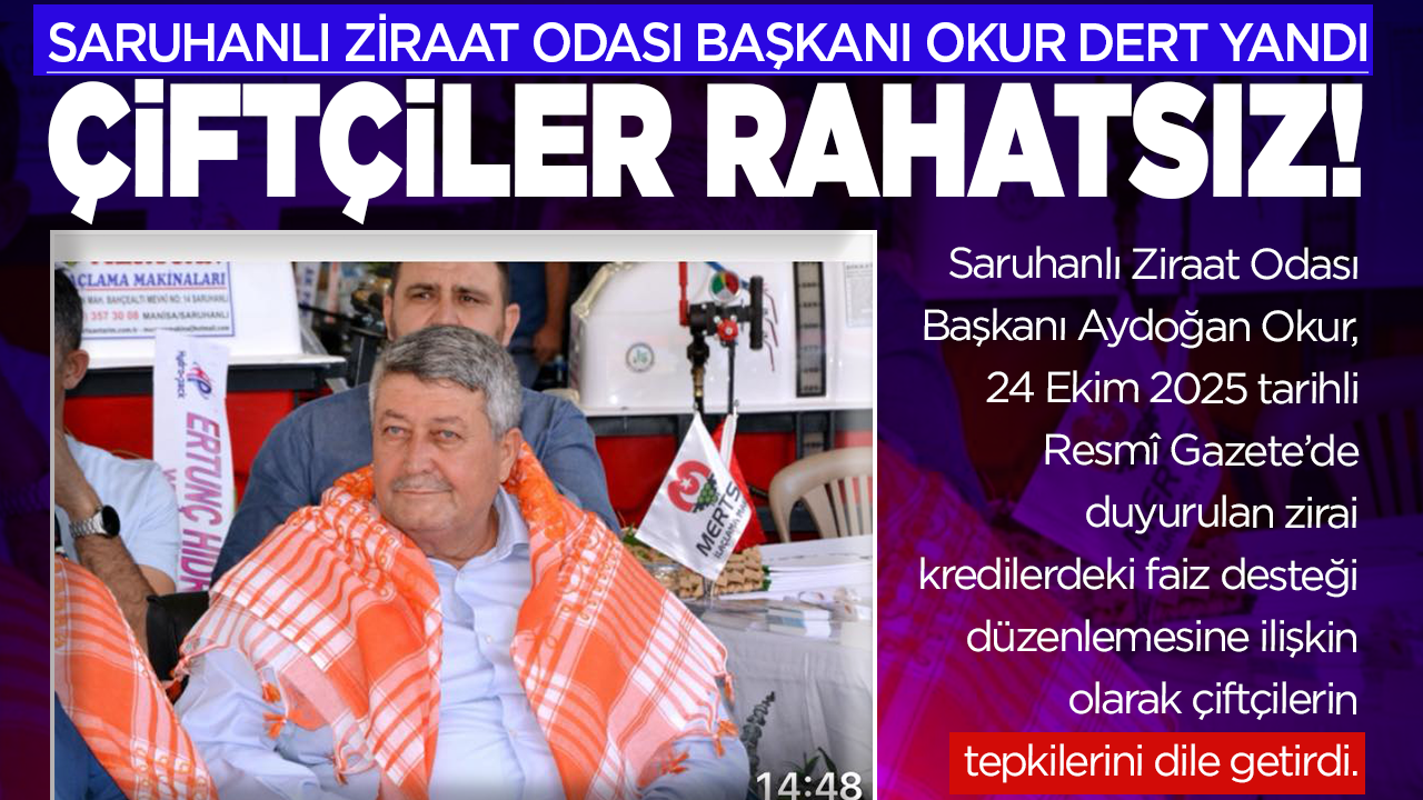 Saruhanlı Ziraat Odası Başkanı Aydoğan Okur, 24 Ekim 2025 tarihli Resmî Gazete’de duyurulan zirai kredilerdeki faiz desteği düzenlemesine ilişkin olarak çiftçilerin tepkilerini dile getirdi.