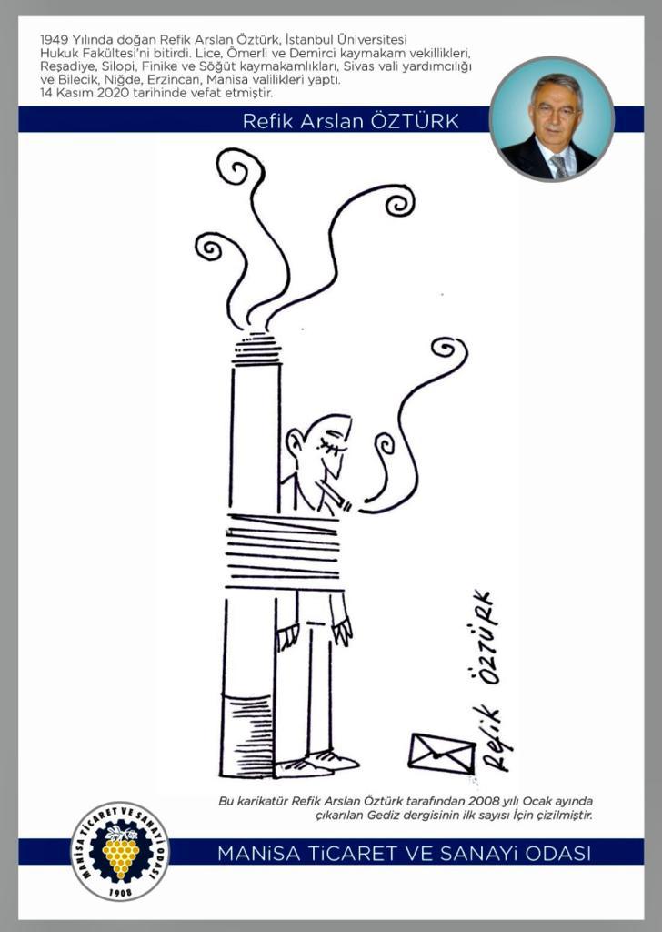 Vali Refik Arslan Öztürk, Manisa Kültür Sanat Kurumu'nun yayımladığı Gediz Dergisi'nin ilk sayısına karikatürle sigara bağımlılığı ve zararını çizmişti. Kendisi eski bir karikatüristti. 12 yıl önce çizdiği ve anlamı her yıl daha da artan karikatürü çoğalttırdı, 2 bini adedi çerçeveletip işyerlerine dağıtmaya başladı.