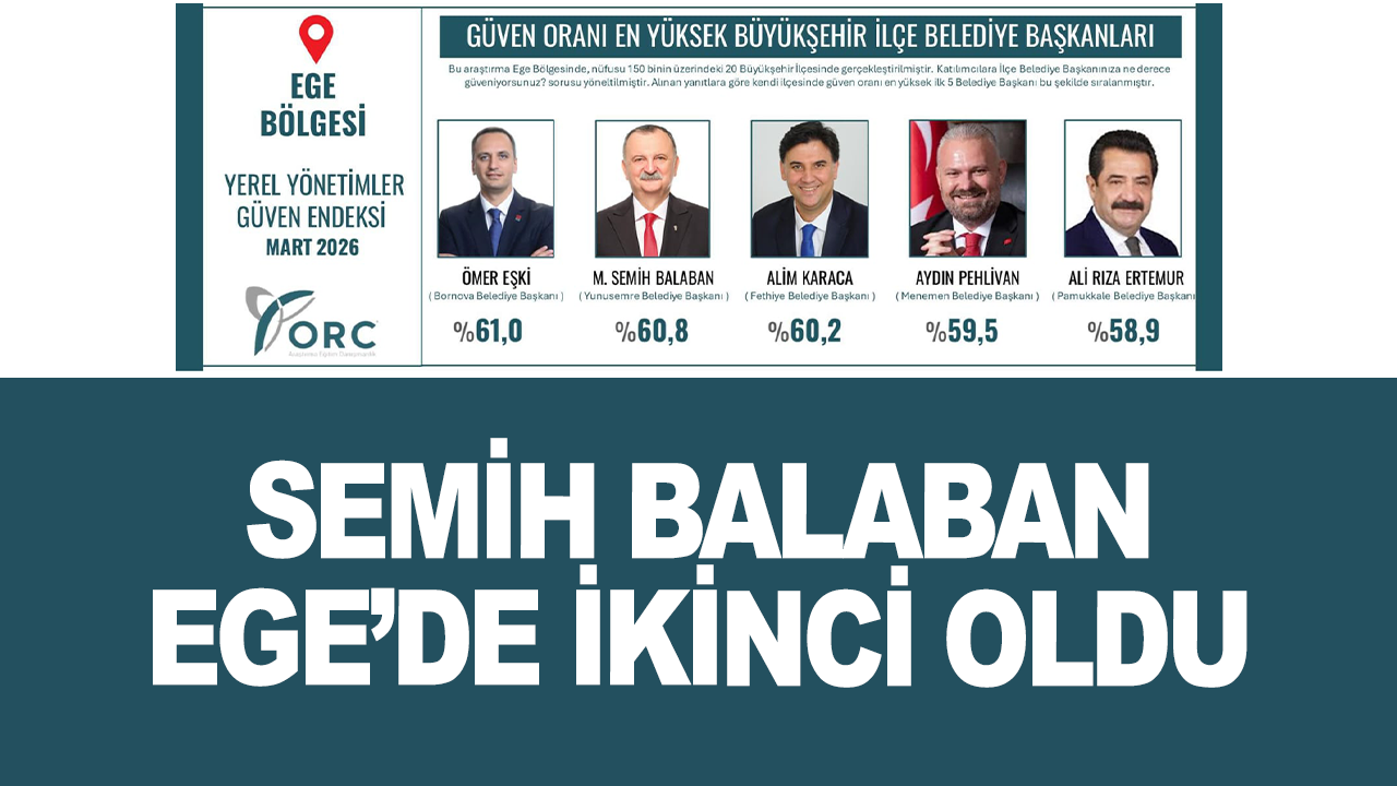 ORC Araştırma tarafından açıklanan “Yerel Yönetimler Güven Endeksi – Mart 2026” sonuçlarına göre, Ege Bölgesi’nde büyükşehir ilçe belediye başkanları arasında güven oranı en yüksek isimler belli oldu. Ege Bölgesi’nde nüfusu 150 binin üzerindeki 20 büyükşehir ilçesinde gerçekleştirilen araştırmada vatandaşlara “İlçe belediye başkanınıza ne derece güveniyorsunuz?” sorusu yöneltildi. Sonuçlara göre listenin ilk sırasında yüzde 61,0 ile Ömer Eşki yer alırken, onu Yunusemre Belediye Başkanı Semih Balaban takip etti. Araştırmada üçüncü sırada yüzde 60,2 ile Alim Karaca, dördüncü sırada yüzde 59,5 ile Aydın Pehlivan, beşinci sırada ise yüzde 58,9 ile Ali Rıza Ertemur yer aldı. Göreve geldiği günden bu yana şeffaf ve hesap verebilir belediyecilik anlayışını ön plana çıkaran Yunusemre Belediye Başkanı Semih Balaban’ın yüksek güven oranı dikkat çekti. Belediye çalışmalarını kamuoyuyla düzenli olarak paylaşan, basın toplantıları ve mahalle buluşmalarıyla vatandaşla doğrudan iletişim kuran Başkan Semih Balaban’ın yönetim anlayışı, araştırma sonuçlarına da yansıdı.