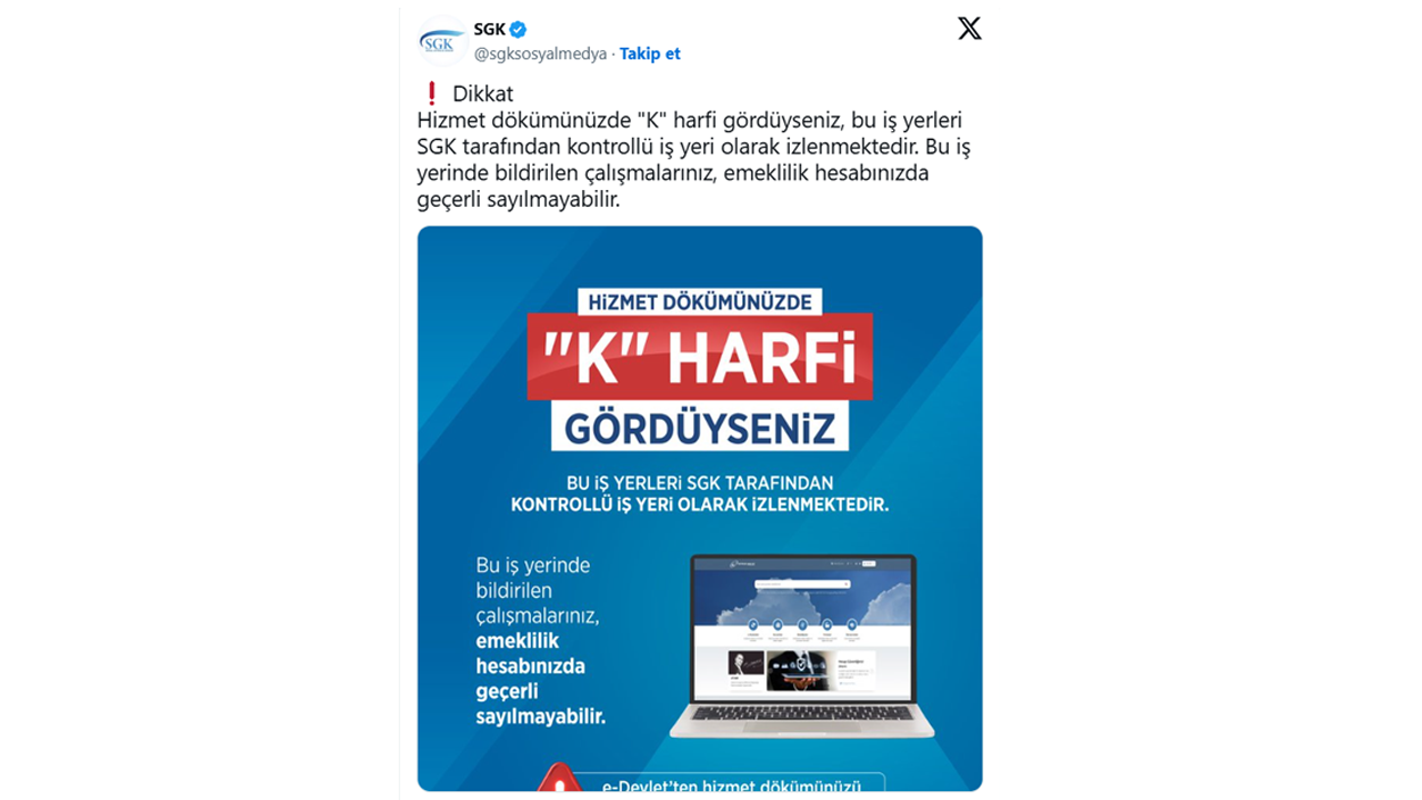 Sosyal medya paylaşımında, hizmet dökümünde "K" harfi olması halinde iş yerlerinin SGK tarafından "Kontrollü İş Yeri" olarak izlendiği ve bu iş yerlerinde bildirilen çalışmaların emekli hesabında geçerli olmayabileceği açıklandı.