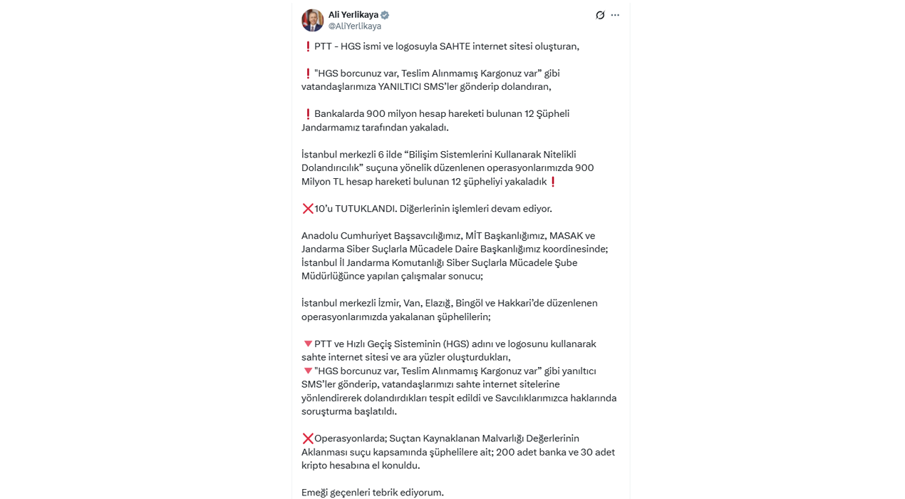 İçişleri Bakanı Ali Yerlikaya, PTT ve HGS isimleri ile logosunu kullanarak sahte internet siteleri kuran ve yanıltıcı SMS’lerle vatandaşları dolandıran 12 kişinin yakalandığını açıkladı. Operasyonda 10 şüpheli tutuklanırken, diğerlerinin işlemleri devam ediyor.