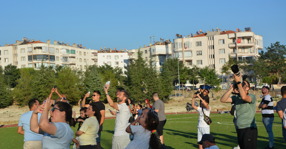 Demirci Kaymakamı Fatih Bayram ve Belediye Başkanı Erkan Kara’da prova uçuşunu vatandaşlarla birlikte izledi.