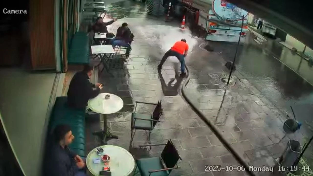 Şov yapayım derken tazyikli suyun azizliğine uğrayan esnaf, o esnada kafe önünde çay içen müşterilerini ıslattı.